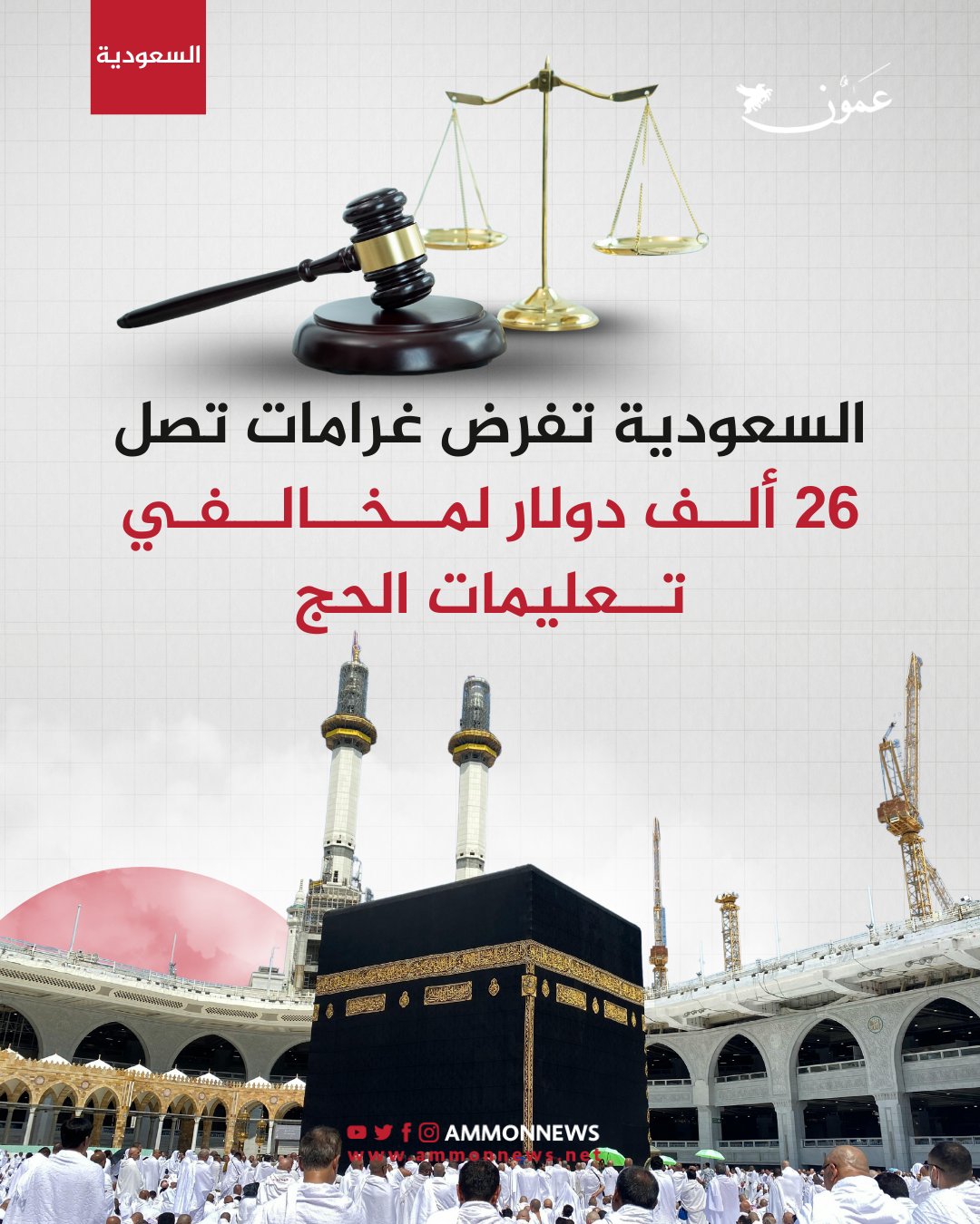 عمون - أعلنت وزارة الداخلية السعودية، الاثنين، عقوبات بحق مخالفي التعليمات التي تقضي بالحصول على تصريح لأداء الحج تصل إلى 20 ألف ريال (5.3 ألف دولار) و100 ألف ريال (26.6 ألف دولار)، تطال كل من يقدم أي مساعدة للمخالفين تؤدي إلى بقائهم في مدينة مكة المكرمة والمشاعر المقدسة ابتداءً من غد (الثلاثاء) وحتى نهاية موسم الحج، مع ترحيل المتسللين من المقيمين والمتخلفين لبلدانهم.
