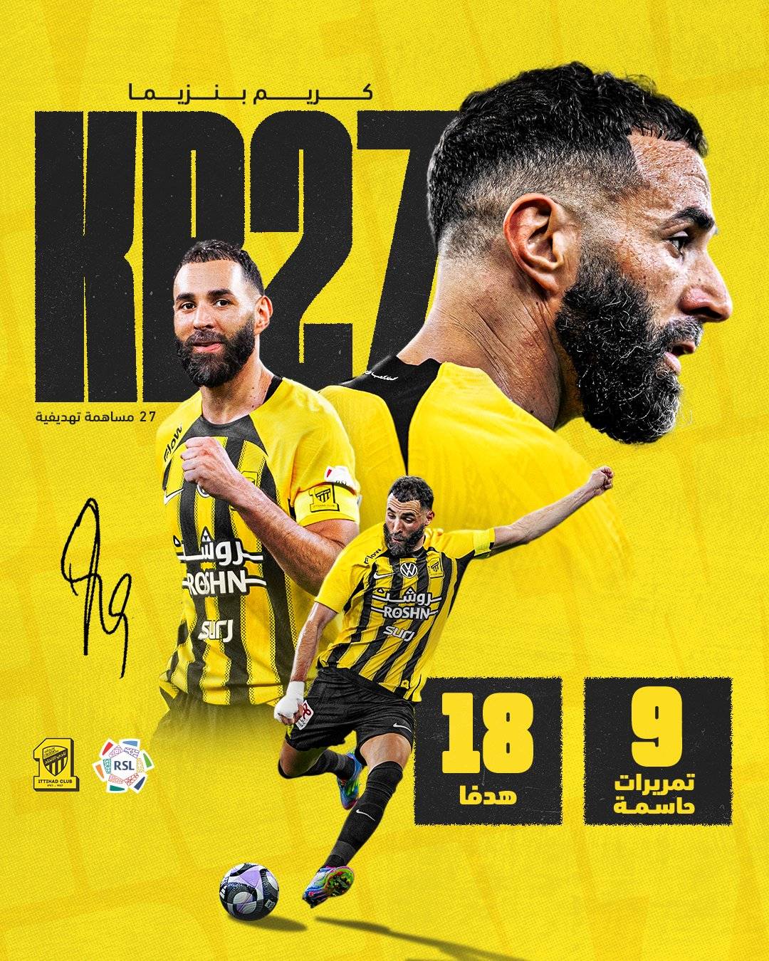الحكومة يحكم بأحكامه .. بنزيما مهاجم الاتحاد يتصدر قائمة المساهمات التهديفية هذا الموسم في دوري روشن السعودي حتى الآن. 18 هدف. 9 تمريرات حاسمة