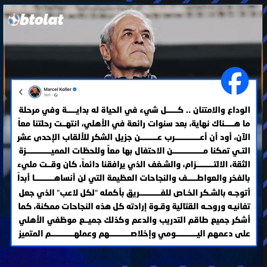 مارسيل كولر يودع النادي الأهلي عبر حسابه الشخصي فيسبوك. الوداع والامتنان "كل شيء في الحياة له بداية وفي مرحلة ما هناك نهاية" وأتمنى دائماً للنادي الأفضل في كل شيء