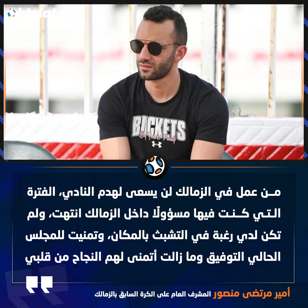 أمير مرتضى منصور. من عمل في الزمالك لن يسعى لهدم النادي، الفترة التي كنت فيها مسؤولًا داخل الزمالك انتهت، ولم تكن لدي رغبة في التشبث بالمكان، وتمنيت للمجلس الحالي التوفيق وما زالت أتمنى لهم النجاح من قلبي