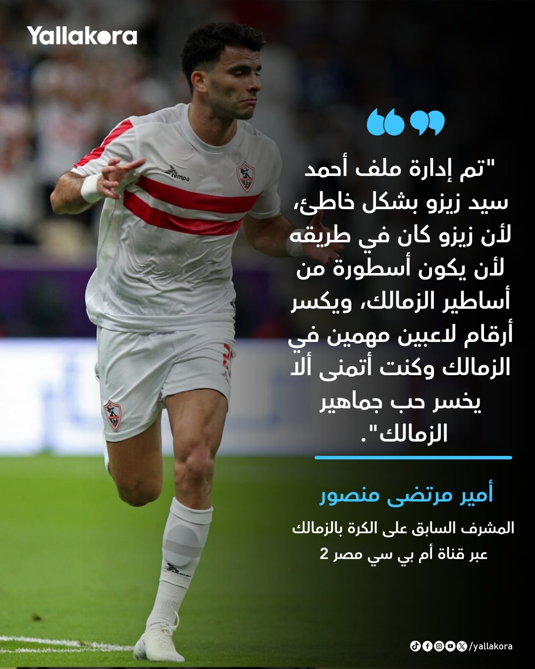 أمير مرتضى منصور. "تم إدارة ملف أحمد سيد زيزو بشكل خاطئ، لأن زيزو كان في طريقه لأن يكون أسطورة من أساطير الزمالك، ويكسر أرقام لاعبين مهمين في الزمالك وكنت أتمنى ألا يخسر حب جماهير الزمالك"