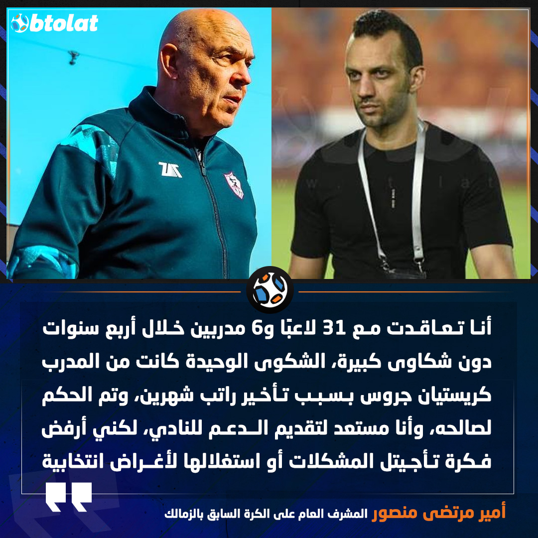 أمير مرتضى منصور. أنا تعاقدت مع 31 لاعبًا و6 مدربين خلال أربع سنوات دون شكاوى كبيرة، الشكوى الوحيدة كانت من المدرب كريستيان جروس بسبب تأخير راتب شهرين، وتم الحكم لصالحه، وأنا مستعد لتقديم الدعم للنادي، لكني أرفض فكرة تأجيل المشكلات أو استغلالها لأغراض انتخابية