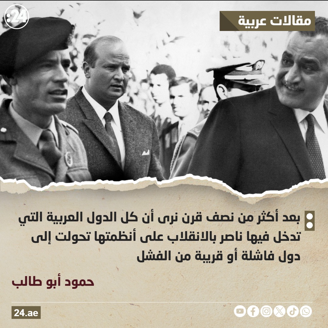 تبنى ناصر الانقلابات في اليمن وليبيا والعراق وجاهد أن يحدث ذلك في السعودية، أنشأ وحدة تعسفية خيالية بين مصر وليبيا، وحوّل لبنان إلى ساحة لمخابراته تتحكم فيها، وورّط مصر والعرب في حرب رعناء خسرت فيها سيناء والجولان والضفة الغربية والقدس، كأقسى هزيمة عسكرية ومعنوية للجيش المصري الذي دخلها بفارق كبير بينه وبين الجيش الإسرائيلي في التسليح والتقنية، ودون حساب مسبق لتدخل أمريكا الحتمي لدعم إسرائيل.