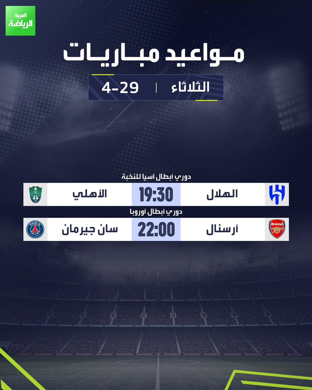 مباريات اليوم. الهلال يواجه الأهلي في مواجهة قارية نارية. أرسنال يستضيف باريس سان جيرمان في ذهاب نصف نهائي دوري أبطال أوروبا _رياضة