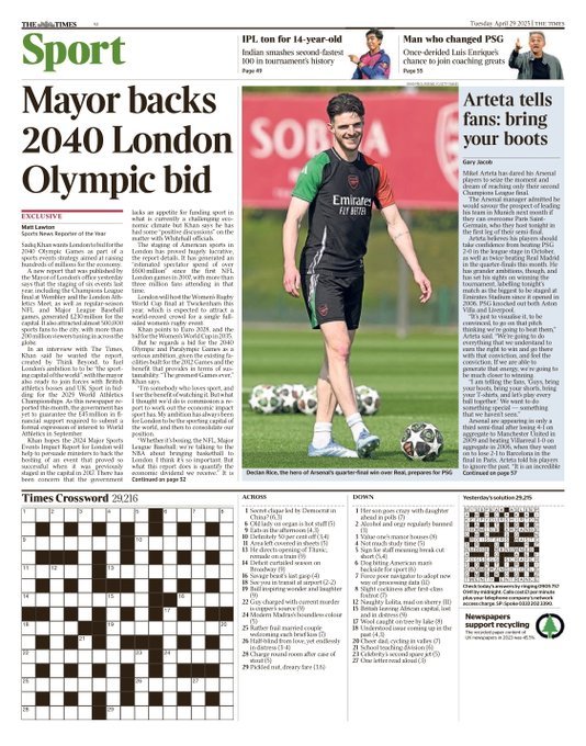 غلاف صحيفة التايمز سبورت.. الرجل الذي غيّر باريس سان جيرمان: دهاء لويس إنريكي الذي كان يُسخر منه سابقًا ينضم إلى عظماء التدريب.. أرتيتا يدعو جماهير أرسنال لرفع سقف استاد الإمارات لإثارة الحماس والصخب في الملعب