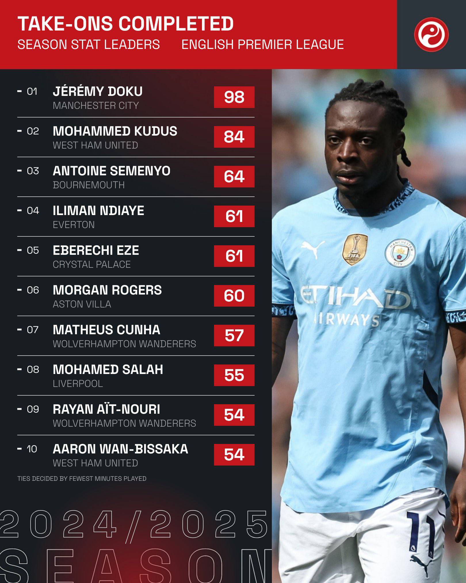 جناح مانشستر سيتي البلحيكي جيريمي دوكو هو اللاعب الوحيد الذي أكمل أكثر من 90 مراوغة في الدوري الإنجليزي هذا الموسم.