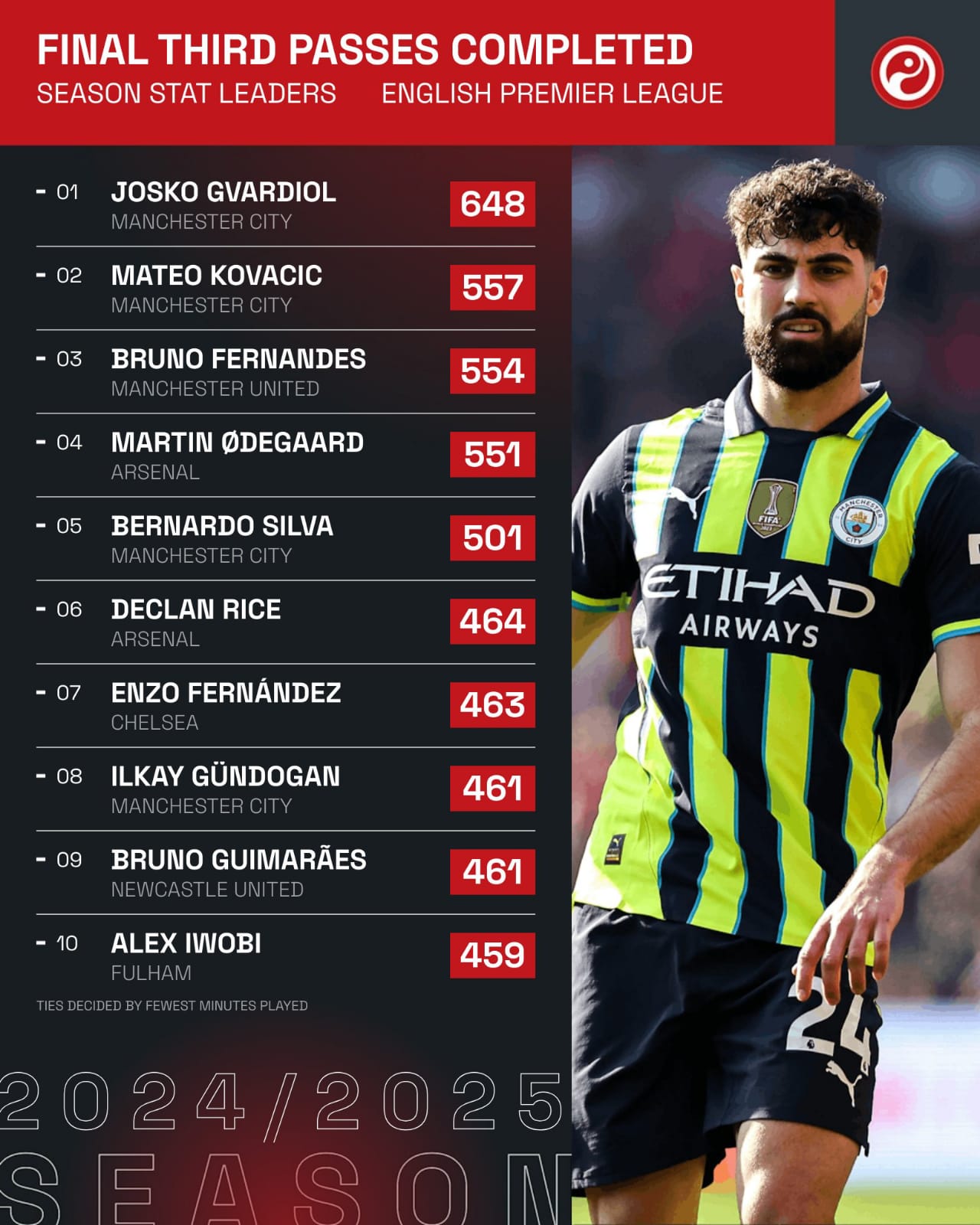 جوسكو غفارديو اللاعب الوحيد الذي سجل أكثر من 600 تمريرة في الثلث الأخير من الملعب في الدوري الإنجليزي الممتاز هذا الموسم وفقا لموقع