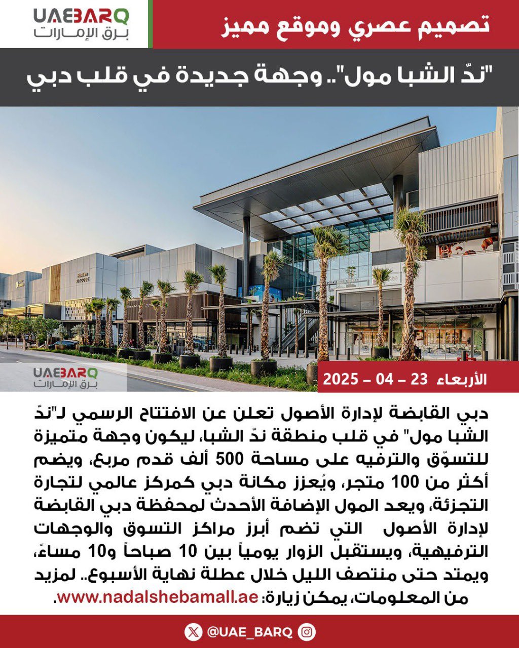 دبي القابضة لإدارة الأصول تعلن عن الافتتاح الرسمي ل"ندّ الشبا مول" في قلب منطقة ندّ الشبا، ليكون وجهة متميزة للتسوّق والترفيه على مساحة 500 ألف قدم مربع.