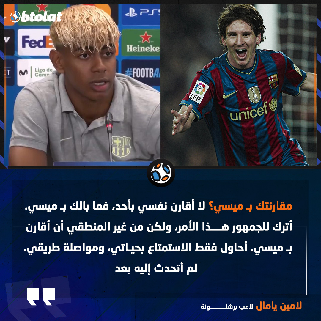 لامين يامال عن مقارنته ب ميسي. "لا أقارن نفسي بأحد، فما بالك ب ميسي. أترك للجمهور هذا الأمر، ولكن من غير المنطقي أن أقارن ب ميسي"