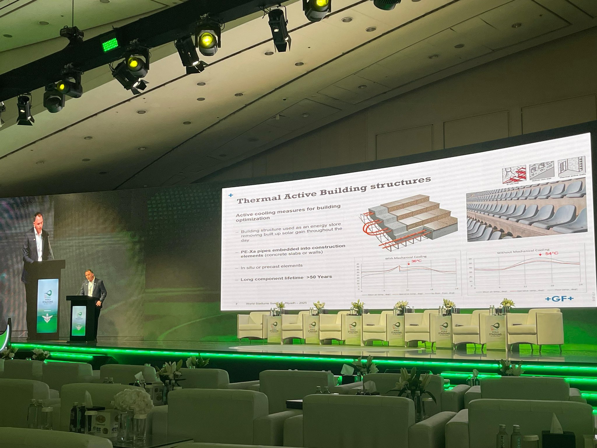 مالكوم بول مدير المنتجات وأنظمة التدفئة والتبريد بالإشعاع التجاري لشركة جي إف بيلدينغ خلال حديثه عن "تعزيز الراحة المقدمة للمتفرجين بإستخدام أنظمة التبريد الإشعاعي": -نعتمد في استراتيجياتنا على استخدام الطاقة الشمسية لتشغيل أنظمة توزيع الحرارة في الملاعب، مما يساهم في خفض حرارة الأسطح من أكثر من 50 درجة إلى نحو 35 درجة، وهو تحوّل مهم في تحسين كفاءة الملاعب. #المؤتمر_الدولي_للملاعب
