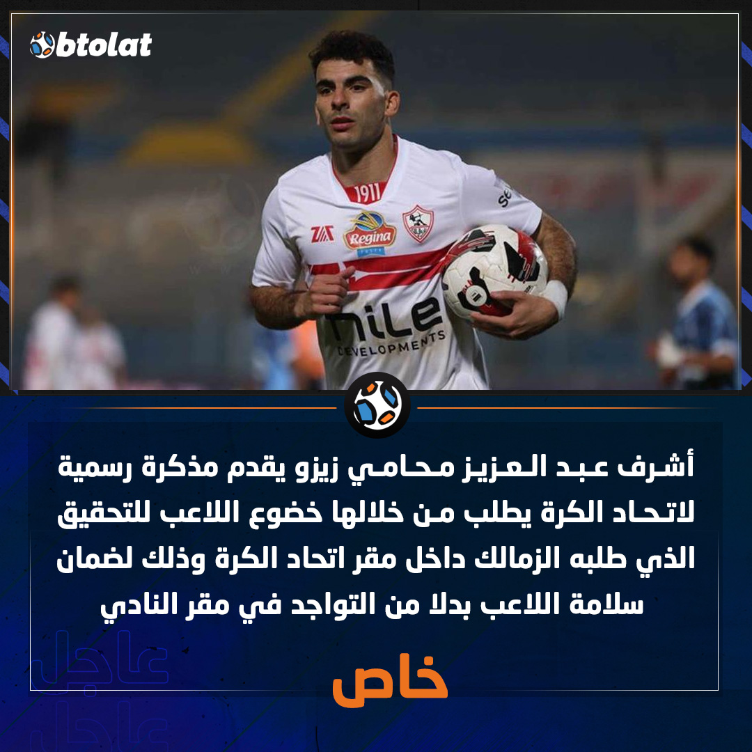 خاص ل بطولات. أشرف عبد العزيز محامي زيزو يقدم مذكرة رسمية لاتحاد الكرة يطلب من خلالها خضوع اللاعب للتحقيق الذي طلبه الزمالك داخل مقر اتحاد الكرة وذلك لضمان سلامة اللاعب بدلا من التواجد في مقر النادي