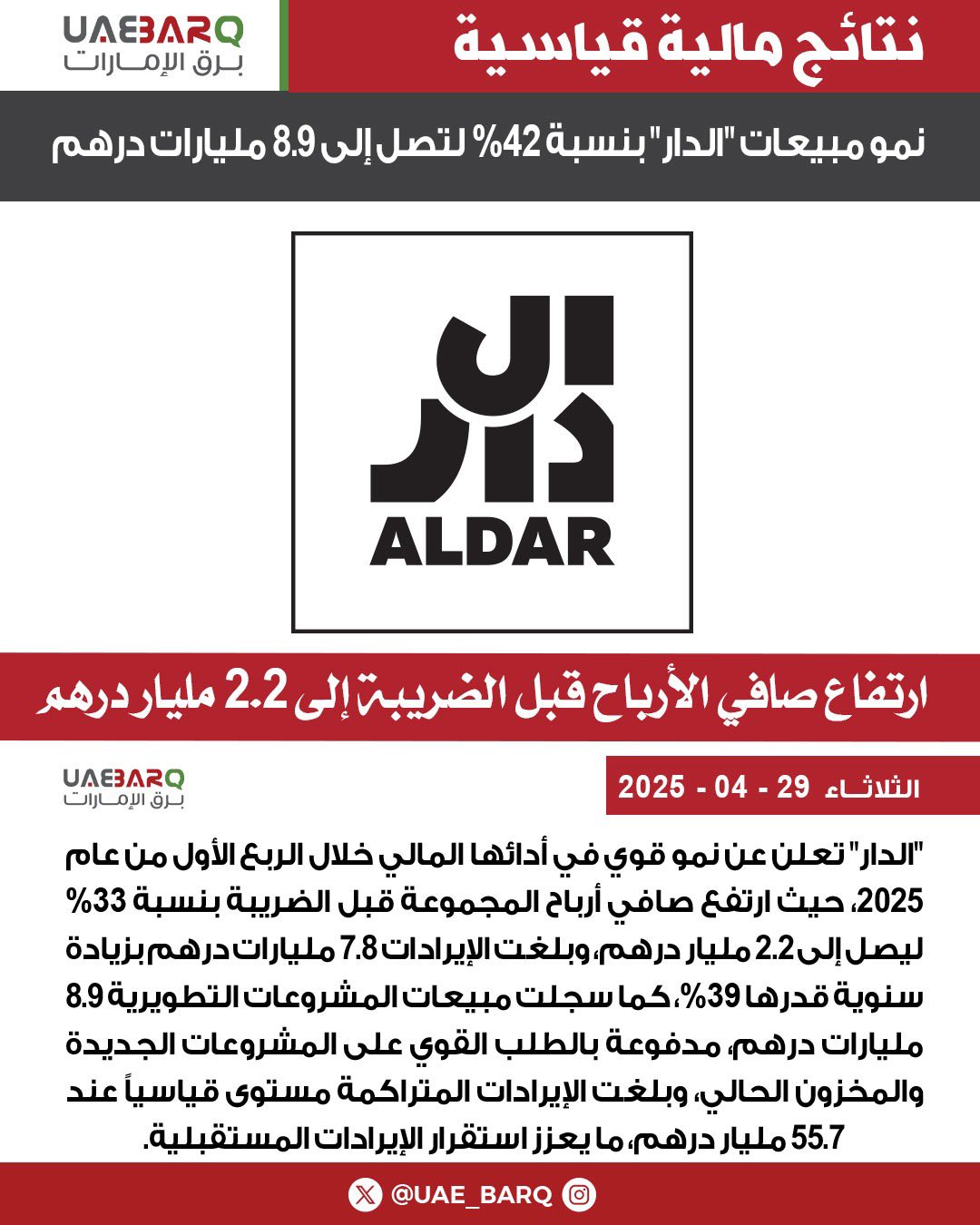 "الدار" تعلن عن نموٍ قويٍ في أدائها المالي خلال الربع الأول من عام 2025، حيث ارتفع صافي أرباح المجموعة قبل الضريبة بنسبة 33% ليصل إلى 2.2 مليار درهم، وبلغت الإيرادات 7.8 مليارات درهم بزيادة سنوية قدرها 39%، كما سجلت مبيعات المشروعات التطويرية 8.9 مليارات درهم، مدفوعة بالطلب القوي على المشروعات الجديدة والمخزون الحالي، وبلغت الإيرادات المتراكمة مستوى قياسياً عند 55.7 مليار درهم، ما يعزز استقرار الإيرادات المستقبلية.. aldar