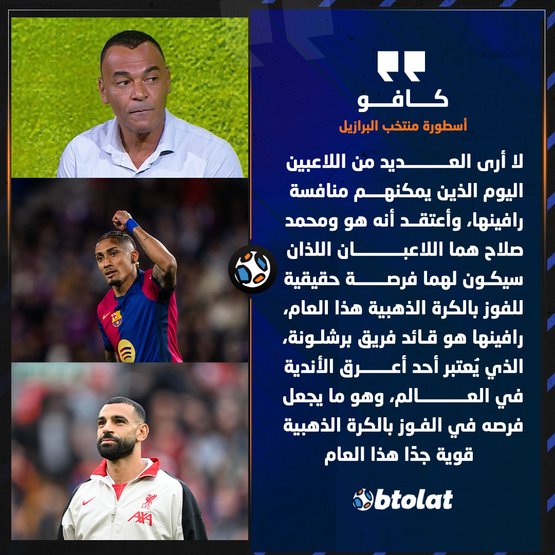 كافو: رافينيا ومحمد صلاح هما اللاعبان اللذان سيكون لهما فرصة حقيقية للفوز بالكرة الذهبية هذا العام، رافينها هو قائد فريق برشلونة، الذي يُعتبر أحد أعرق الأندية في العالم، وهو ما يجعل فرصه في الفوز بالكرة الذهبية قوية جدًا هذا العام