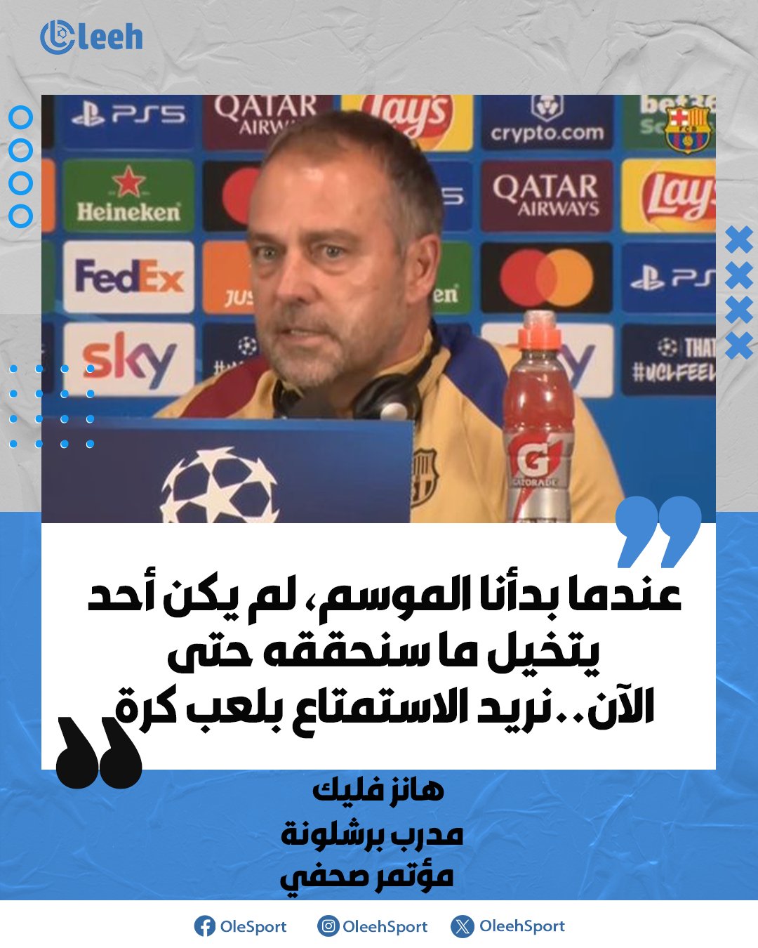 هانز فليك من المؤتمر الصحفي.. "مع بداية الموسم، لم يكن أحد يتوقع ما وصلنا إليه حتى الآن.. هدفنا هو الاستمتاع بكرة القدم وجعل جماهيرنا تستمتع معنا بما نقدمه على أرض الملعب."