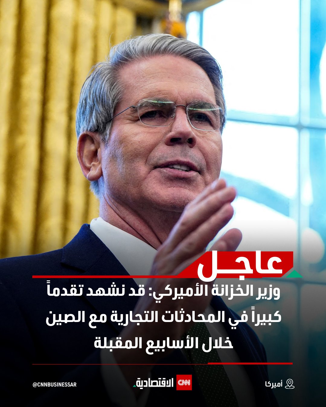 عاجل| وزير الخزانة الأميركي سكوت بيسنت: قد نشهد تقدماً كبيراً في المحادثات التجارية مع الصين خلال الأسابيع المقبلة. #العالم_بلغة_الأعمال