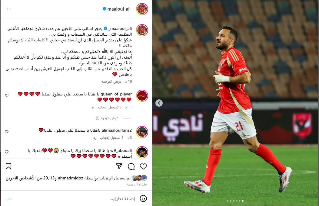 علي معلول عبر إنستجرام. "عجز لساني على التعبير عن مدى شكري لجماهير الأهلي العظيمة التي ساندتني في الصعاب و وثقت بي.. شكرا على تقدير الجميل الذي لن أنساه في حياتي !! كلمات الثناء لا توفيكم حقكم !! ما توفيقي الا بالله وتحفيزكم و دعمكم لي.. أتمنى ان أكون دائماً عند حسن ظنكم و أنا عند وعدي لكم بأن لا أخذلكم طيلة وجودي في القلعة الحمراء.. كل الحب و التقدير من القلب إلى القلب لجميل العيش بين أناس احتضنوني بإخلاص "
