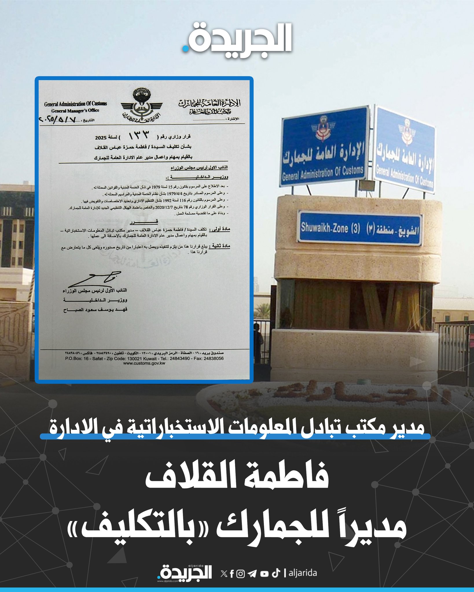 صدر، الأربعاء، قرار وزاري حمل الرقم 133 لسنة 2025، يتم بموجبه تكليف مدير مكتب تبادل المعلومات الاستخباراتية في الإدارة العامة للجمارك، فاطمة حمزة القلاف، بالقيام بمهام وأعمال المدير العام للإدارة، إضافة إلى عملها.
