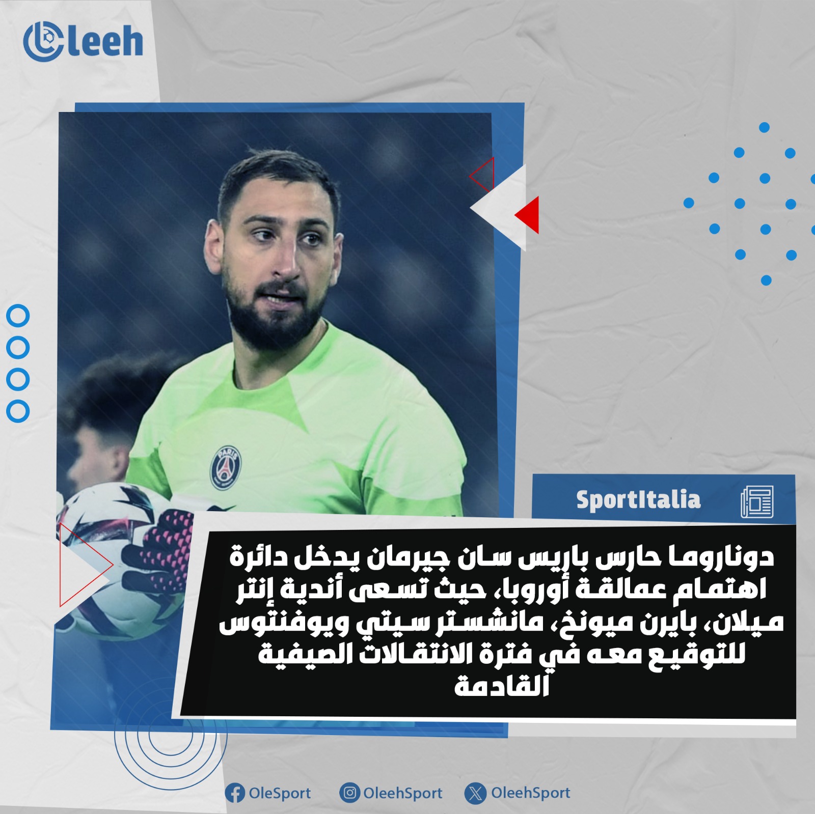 يتنافس كل من إنتر ميلان، بايرن ميونخ، مانشستر سيتي ويوفنتوس على ضم الحارس الإيطالي جيانلويجي دوناروما، حامي عرين باريس سان جيرمان للتعاقد معه في الصيف القادم