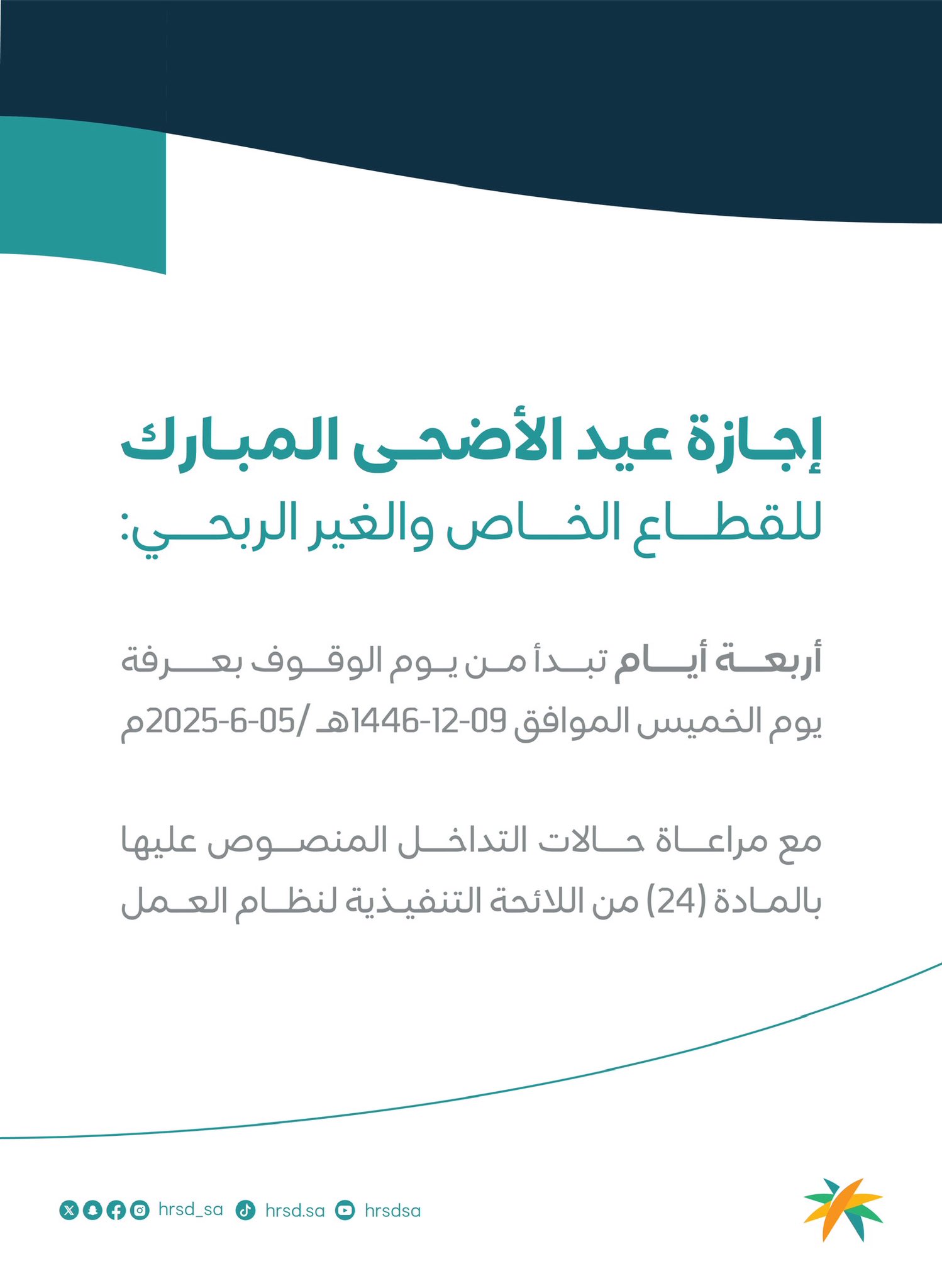 الموارد البشرية: موعد إجازة عيد الأضحى المبارك 1446ه / 2025م للقطاعين الخاص وغير الربحي