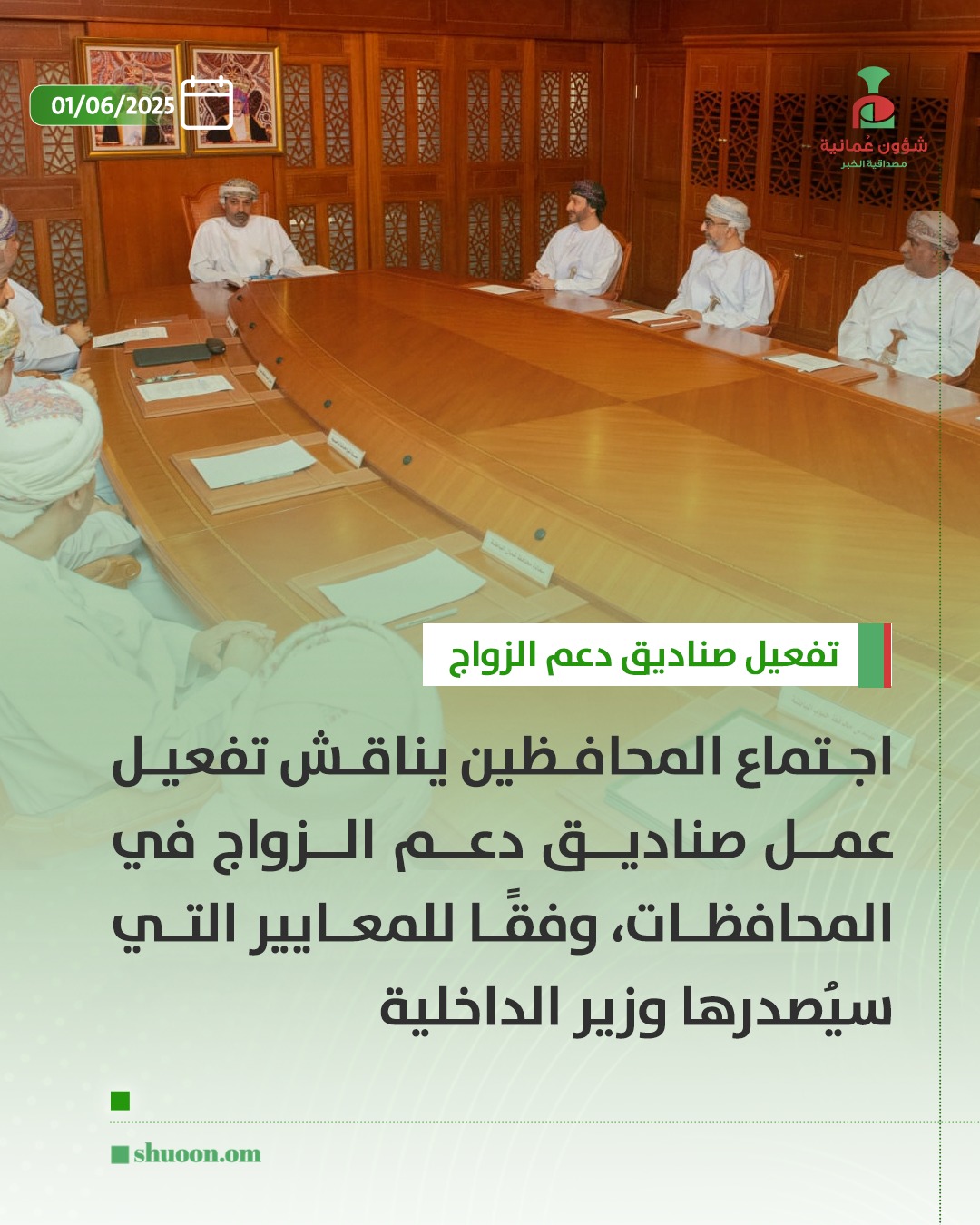 شؤون عُمانية| اجتماع المحافظين يناقش تفعيل عمل صناديق دعم الزواج في المحافظات، وفقًا للمعايير التي سيُصدرها وزير الداخلية