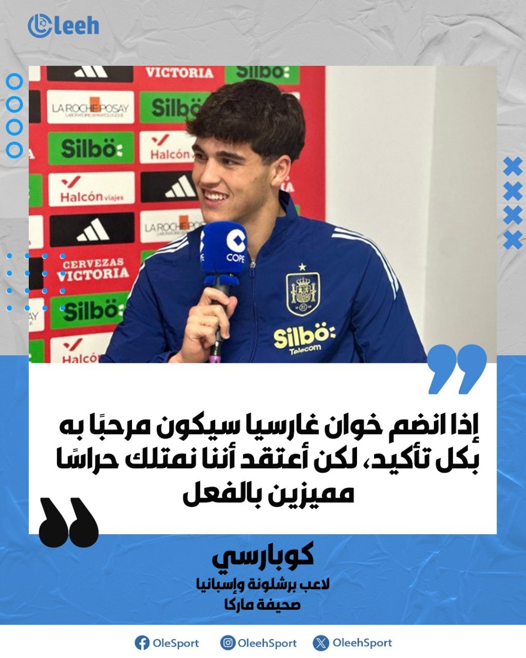 ما رأيك في إنضمام حارس إسبانيول خوان غارسيا إلى برشلونة؟ "كوبارسي: إذا انضم خوان غارسيا سيكون مرحبًا به بكل تأكيد، لكن أعتقد أننا نمتلك حراسًا مميزين بالفعل ."