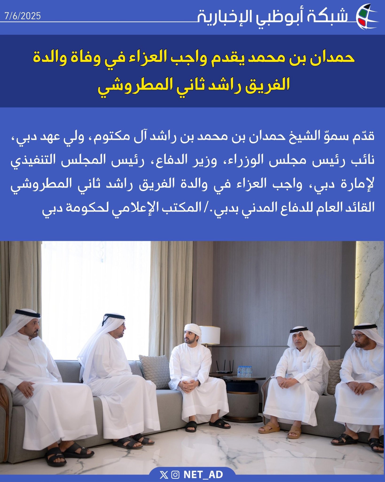 قدّم سموّ الشيخ حمدان بن محمد بن راشد آل مكتوم، ولي عهد دبي، نائب رئيس مجلس الوزراء، وزير الدفاع، رئيس المجلس التنفيذي لإمارة دبي، واجب العزاء في والدة الفريق راشد ثاني المطروشي القائد العام للدفاع المدني بدبي./ المكتب الإعلامي لحكومة دبي