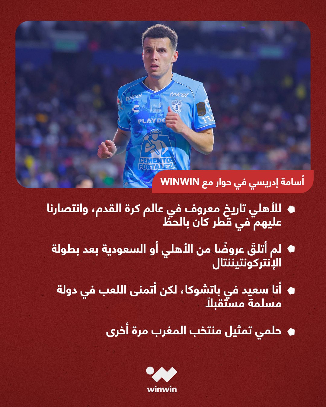 المغربي أسامة إدريسي، لاعب باتشوكا المكسيكي، يتحدث في حوار خاص مع موقع winwin عن حظوظ فريقه، والأهلي المصري، والوداد المغربي في التأهل إلى الدور الثاني من كأس العالم للأندية، كما يكشف عن طموحاته في العودة لتمثيل منتخب أسود الأطلس ملعب لكل الرياضات | #كأس_العالم_للأندية