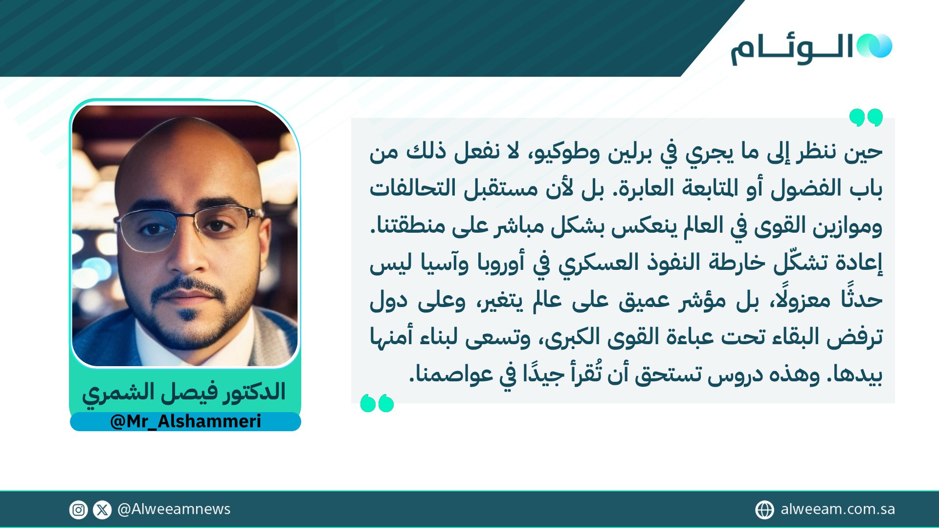 حين ننظر إلى ما يجري في برلين وطوكيو، لا نفعل ذلك من باب الفضول أو المتابعة العابرة. بل لأن مستقبل التحالفات وموازين القوى في العالم ينعكس بشكل مباشر على منطقتنا. إعادة تشكّل خارطة النفوذ العسكري في أوروبا وآسيا ليس حدثًا معزولًا، بل مؤشر عميق على عالم يتغير، وعلى دول ترفض البقاء تحت عباءة القوى الكبرى، وتسعى لبناء أمنها بيدها. وهذه دروس تستحق أن تُقرأ جيدًا في عواصمنا.