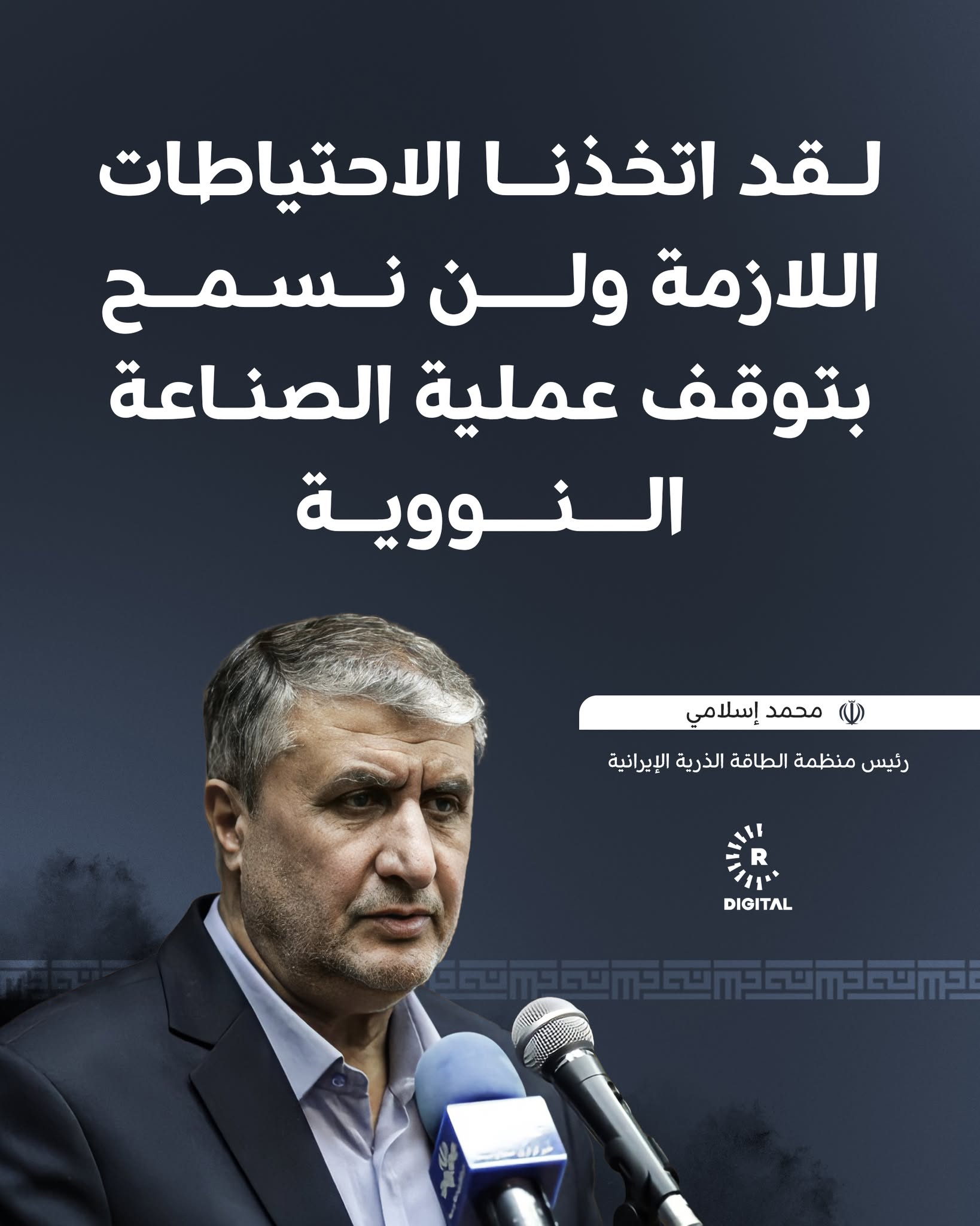 رئيس منظمة الطاقة الذرية الإيرانية محمد إسلامي تعليقاً على الهجمات على منشآتهم النووية: - لقد اتخذنا الاحتياطات اللازمة ونقوم بتقييم الأضرار - كانت الاستعدادات لعملية الترميم قد توقّعت مسبقاً - لن نسمح بحدوث أي توقف في مسار الإنتاج