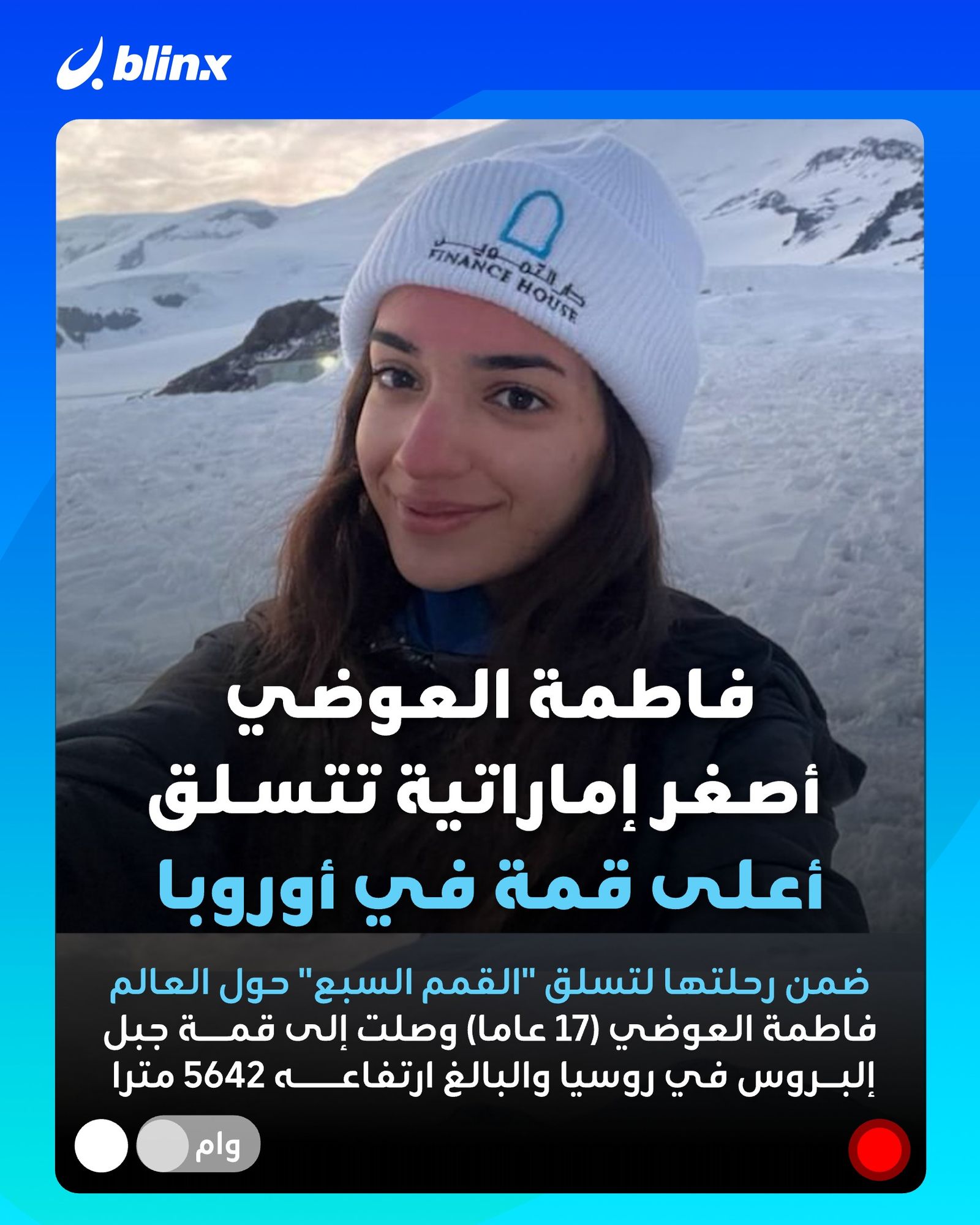 الإماراتية فاطمة العوضي البالغة 17 عاما تعانق السحاب! كتبت اسمها في سجل المجد، وأصبحت أصغر إماراتية تتسلّق قمة "إلبروس" الشاهقة في روسيا ضمن تحدي "القمم السبع"
