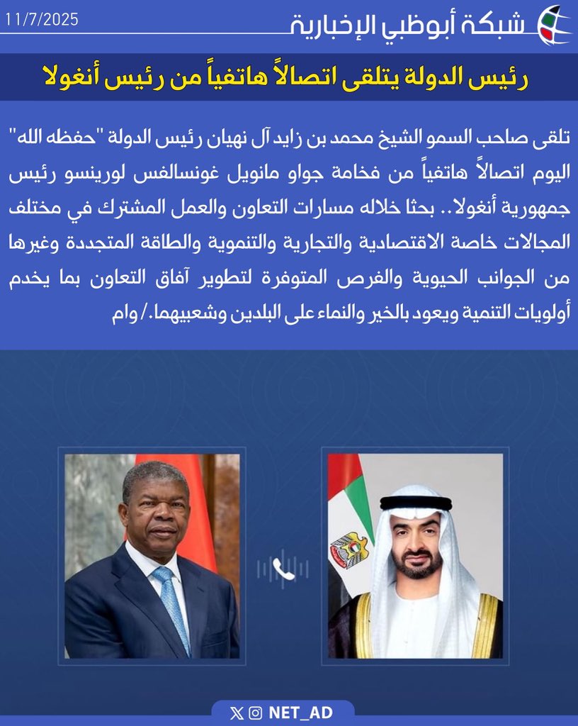 تلقى صاحب السمو الشيخ محمد بن زايد آل نهيان رئيس الدولة "حفظه الله" اليوم اتصالاً هاتفياً من فخامة جواو مانويل غونسالفس لورينسو رئيس جمهورية أنغولا.. بحثا خلاله مسارات التعاون والعمل المشترك في مختلف المجالات خاصة الاقتصادية والتجارية والتنموية والطاقة المتجددة وغيرها من الجوانب الحيوية والفرص المتوفرة لتطوير آفاق التعاون بما يخدم أولويات التنمية ويعود بالخير والنماء على البلدين وشعبيهما./ وام