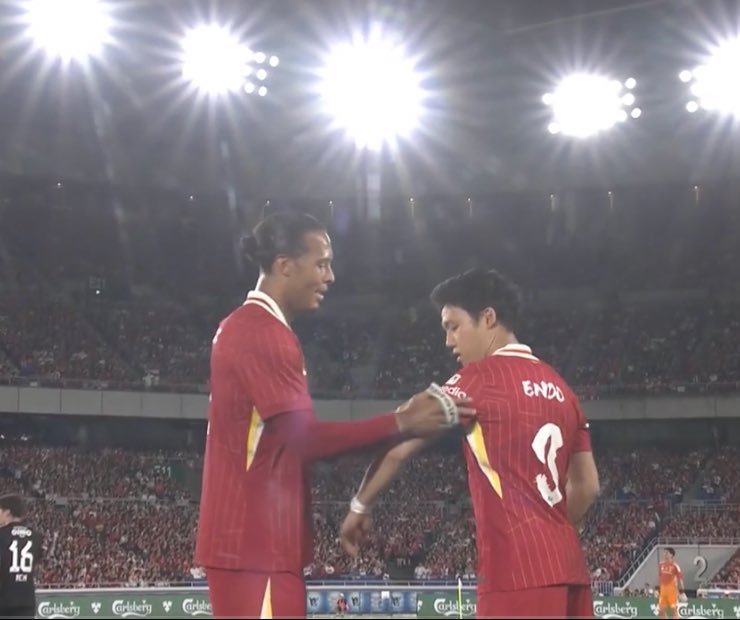 لقطة رائعة بكل تأكيد. بالرغم من وجود محمد صلاح في الملعب أثناء نزول إندو. فان دايك قام بمنح إندو شارة القيادة تقديراً له أمام الجماهير اليابانية