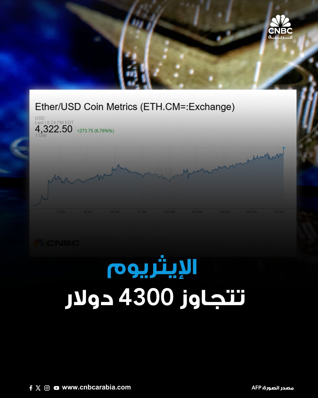 وصل سعر عملة الإيثريوم، ثاني أكبر العملات المشفرة، إلى 4300 دولار على منصة بينانس Binance بعد كسر حاجز 4000 دولار في اليوم السابق، حيث أشار المحللون إلى التصفية ودوران العملات البديلة المحتمل وسط ارتفاع المعنويات في سوق الكريبتو.