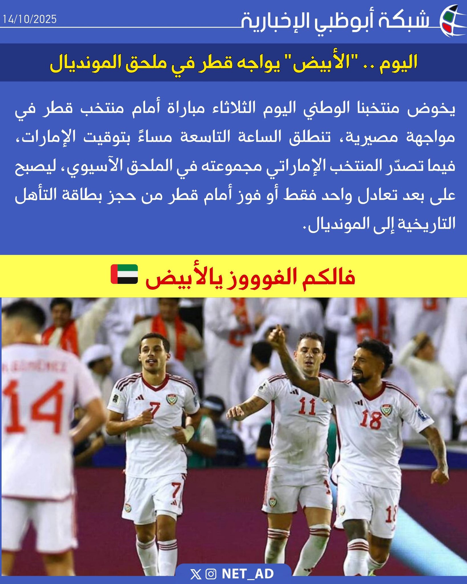 اليوم .. "الأبيض" يواجه قطر في ملحق المونديال. يخوض منتخبنا الوطني اليوم الثلاثاء مباراة أمام منتخب قطر في مواجهة مصيرية، تنطلق الساعة التاسعة مساءً بتوقيت الإمارات، فيما تصدّر المنتخب الإماراتي مجموعته في الملحق الآسيوي، ليصبح على بعد تعادل واحد فقط أو فوز أمام قطر من حجز بطاقة التأهل التاريخية إلى المونديال