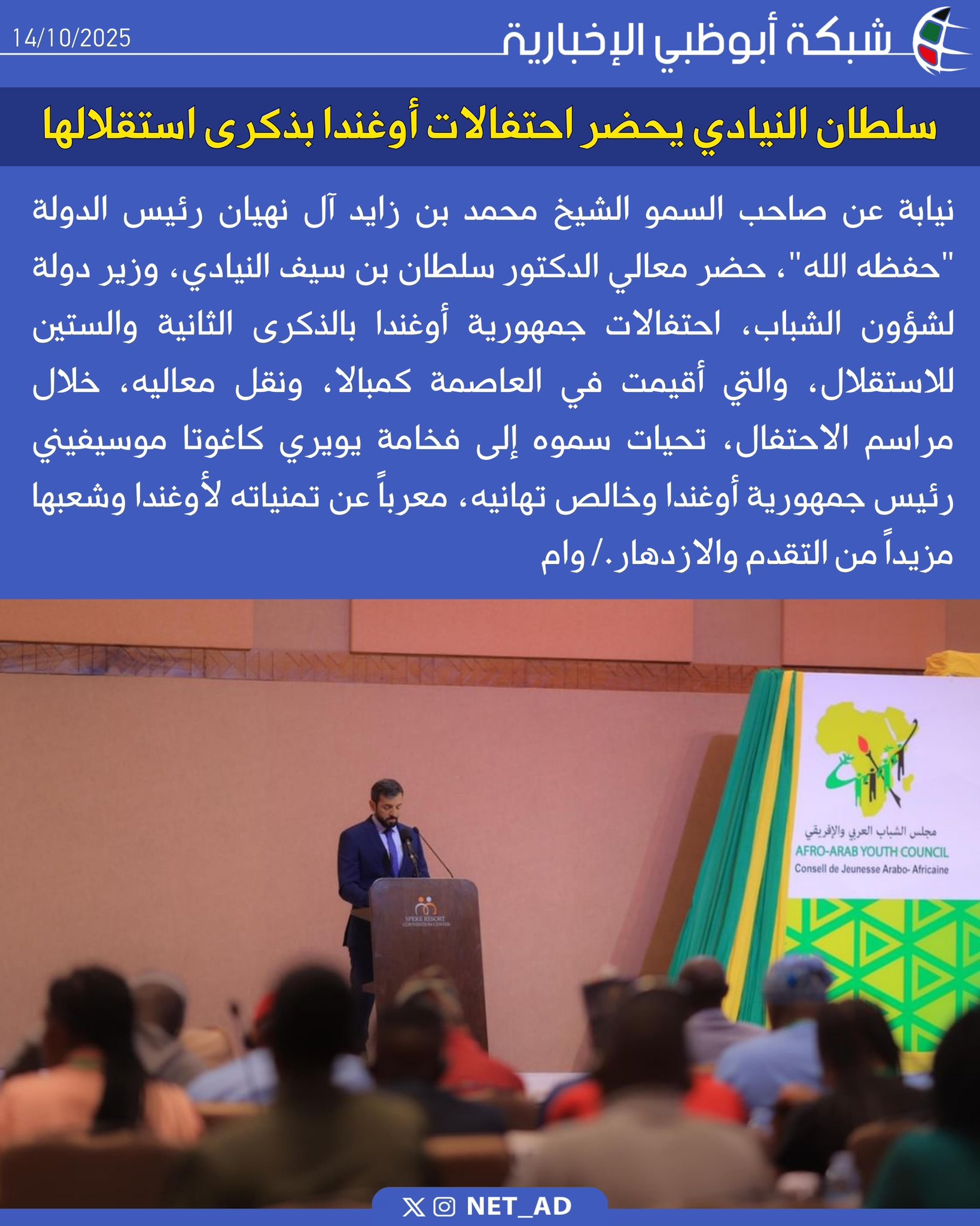 سلطان النيادي يحضر احتفالات أوغندا بذكرى استقلالها. نيابة عن صاحب السمو الشيخ محمد بن زايد آل نهيان رئيس الدولة "حفظه الله"، حضر معالي الدكتور سلطان بن سيف النيادي، وزير دولة لشؤون الشباب، احتفالات جمهورية أوغندا بالذكرى الثانية والستين للاستقلال، والتي أقيمت في العاصمة كمبالا، ونقل معاليه، خلال مراسم الاحتفال، تحيات سموه إلى فخامة يويري كاغوتا موسيفيني رئيس جمهورية أوغندا وخالص تهانيه، معرباً عن تمنياته لأوغندا وشعبها مزيداً من التقدم والازدهار./ وام
