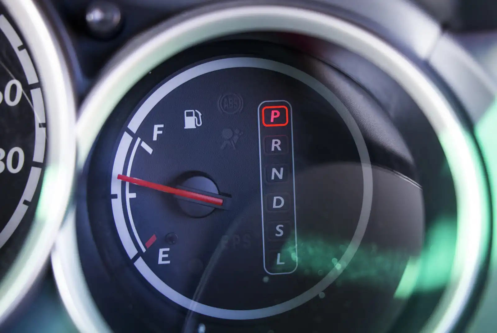 مؤشر الوقود يقترب من الامتلاء في السيارة، مشهد يعكس قيادة آمنة وحماية أفضل للمحرك والمضخة.