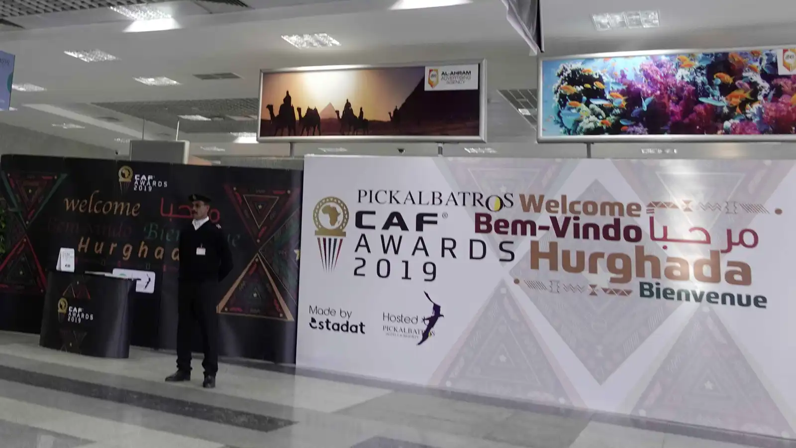 فرد أمن مصري، يقف أمام لافتة ترحيبية بمطار الغردقة الدولي، بتاريخ 6 يناير 2020.