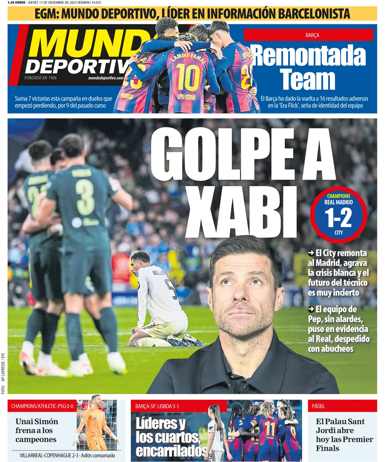 ركزت الصحيفة على هزيمة ريال مدريد أمام مانشستر سيتي 2-1 في دوري أبطال أوروبا وكتبت: "دون رصيد" و"هزيمة جديدة تجعل تشابي ألونسو أكثر تضررًا".