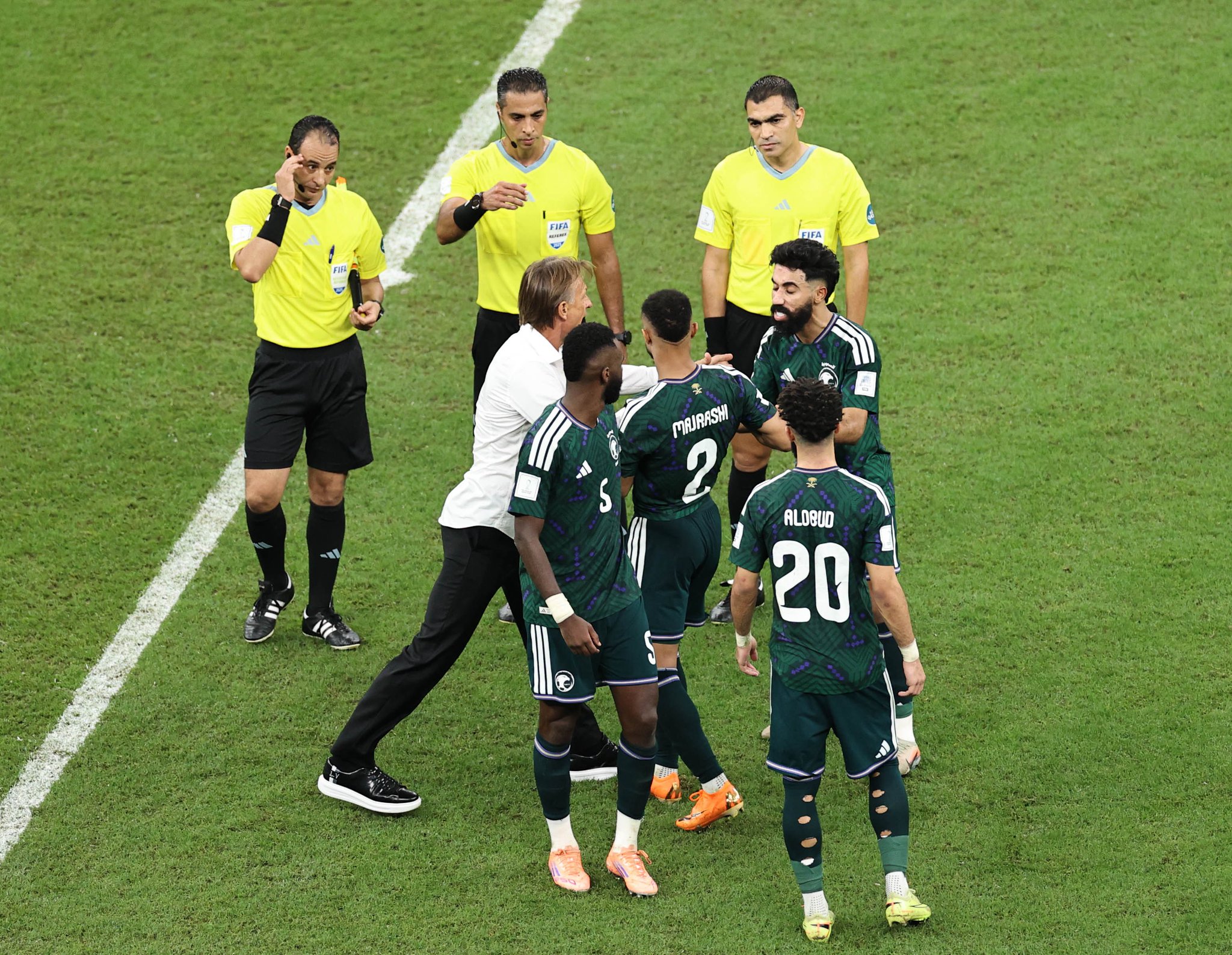 الفرنسي هيرفي رينارد يُبعد اللاعبين عن التوجه لحكم المباراة والنقاش بعد نهاية الشوط الثاني. #السعودية_فلسطين