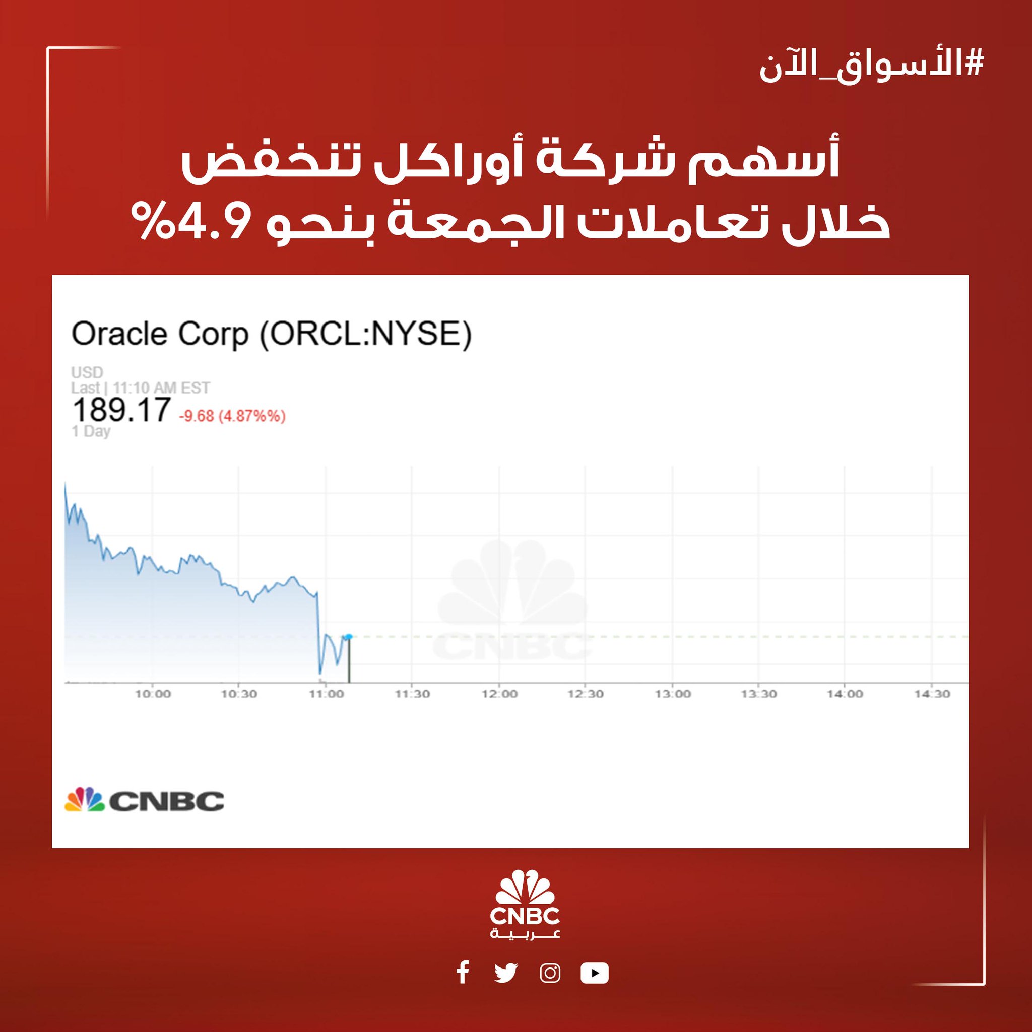 انخفض سهم أوراكل بأكثر من 3% في التداولات بعد تسجيله خسائر بنسبة بلغت 1.3%.