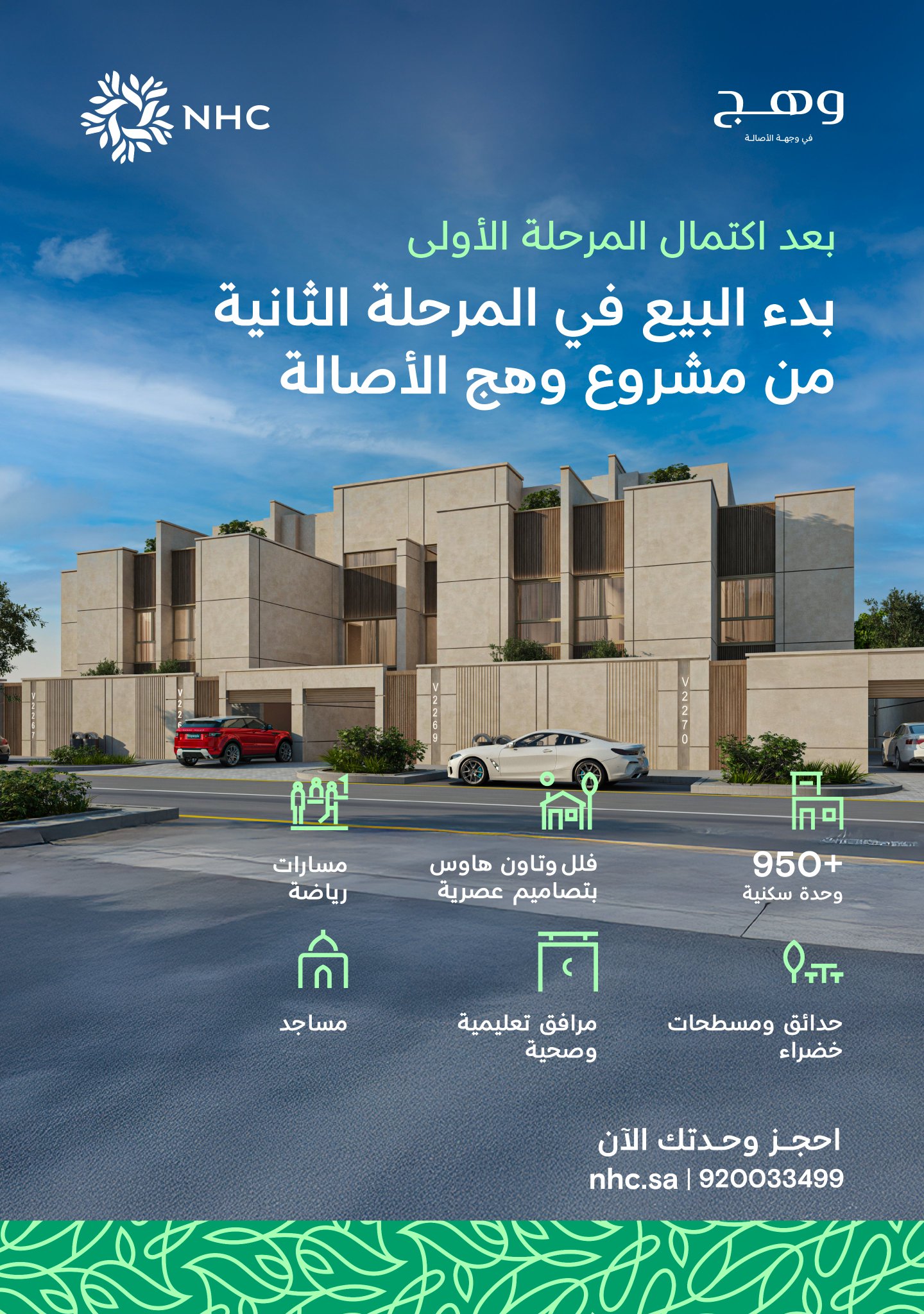 أعلنت NHC عن بدء البيع في المرحلة الثانية من مشروعي «وهج الأصالة» و «رحاب الأصالة» في وجهة الأصالة بالرياض، بعد اكتمال المرحلة الأولى في كليهما، ما يعكس حجم الإقبال الكبير على المشروعين وثقة عملاء NHC بما تقدمه من وجهات عمرانية متكاملة ترتقي بجودة الحياة.