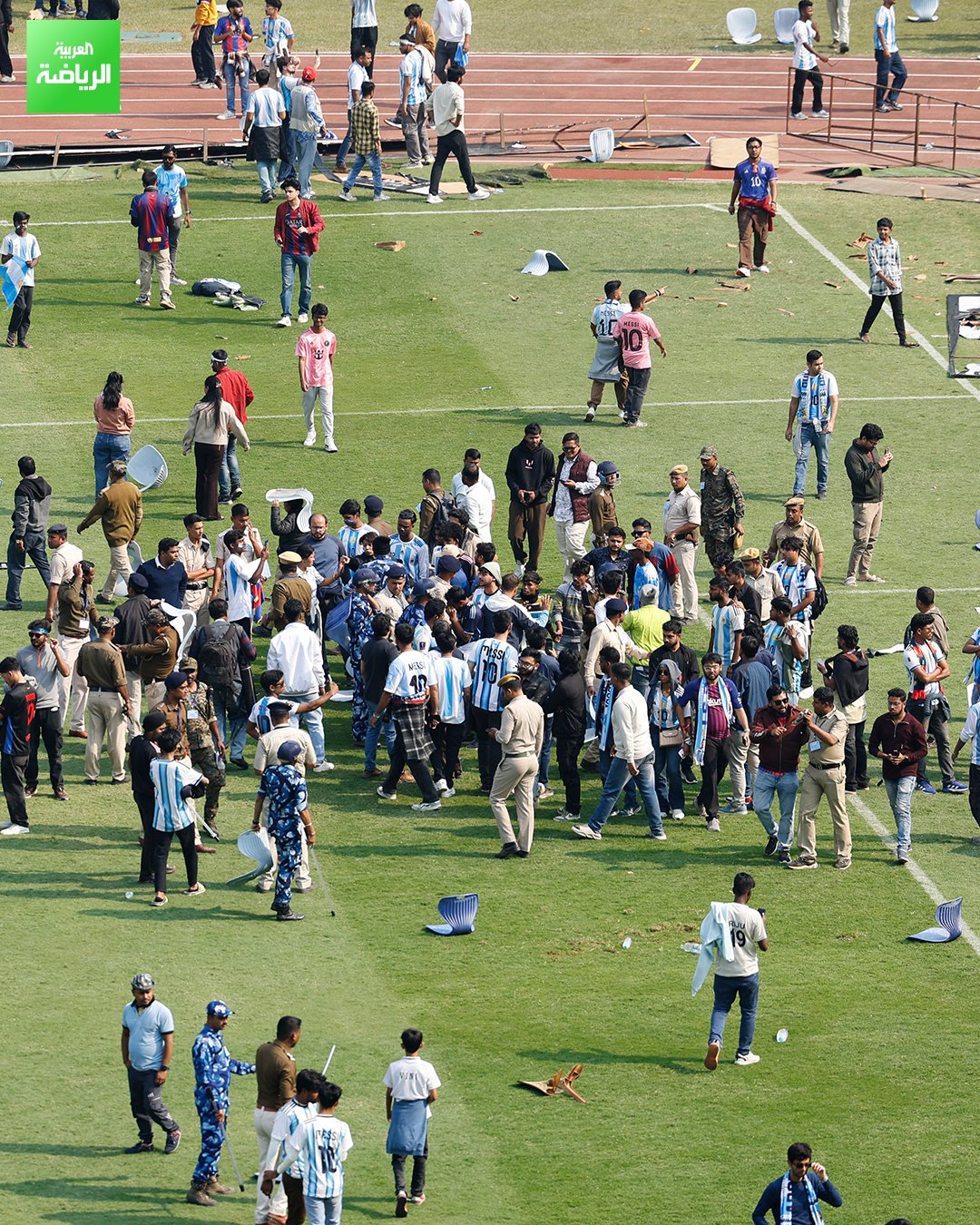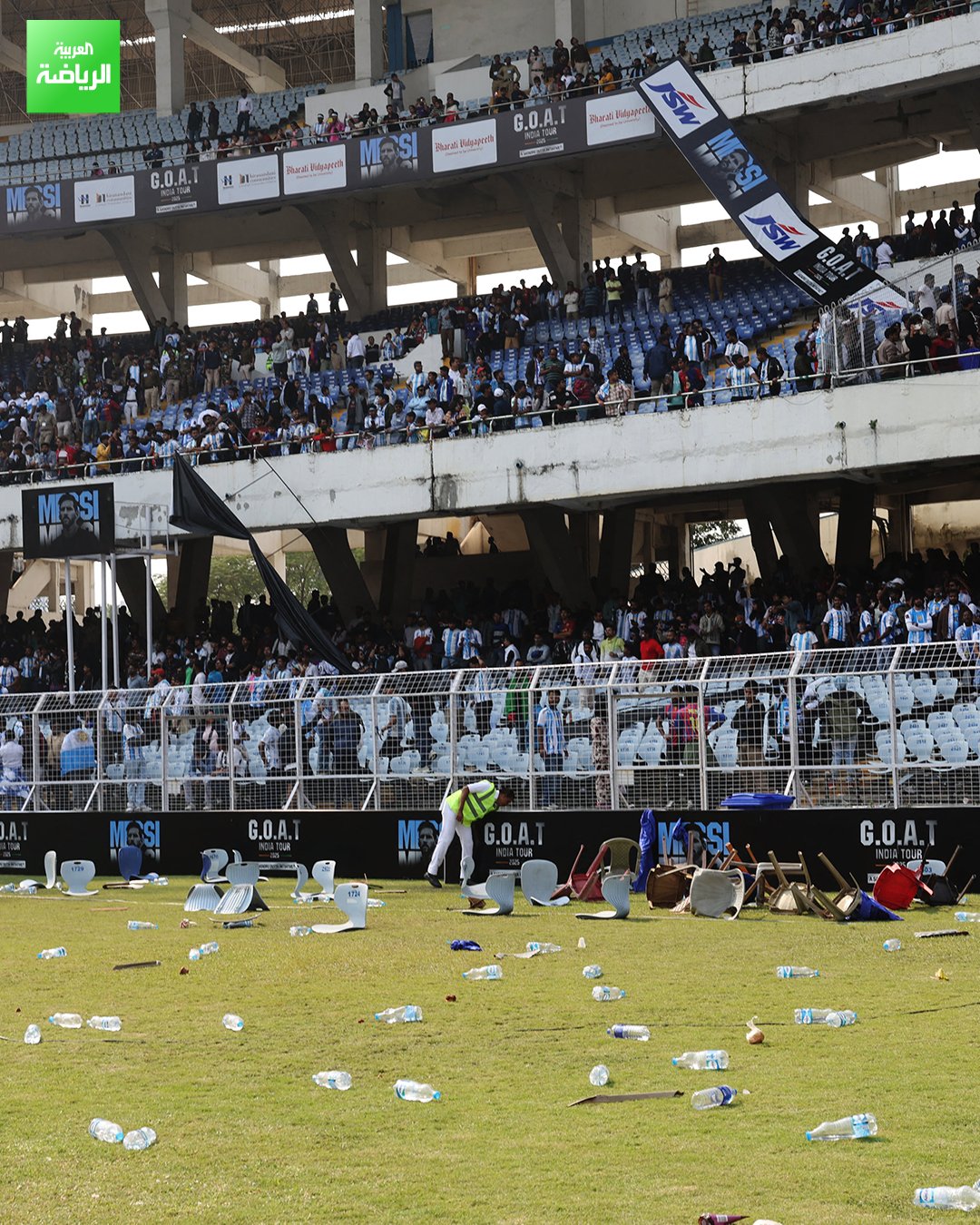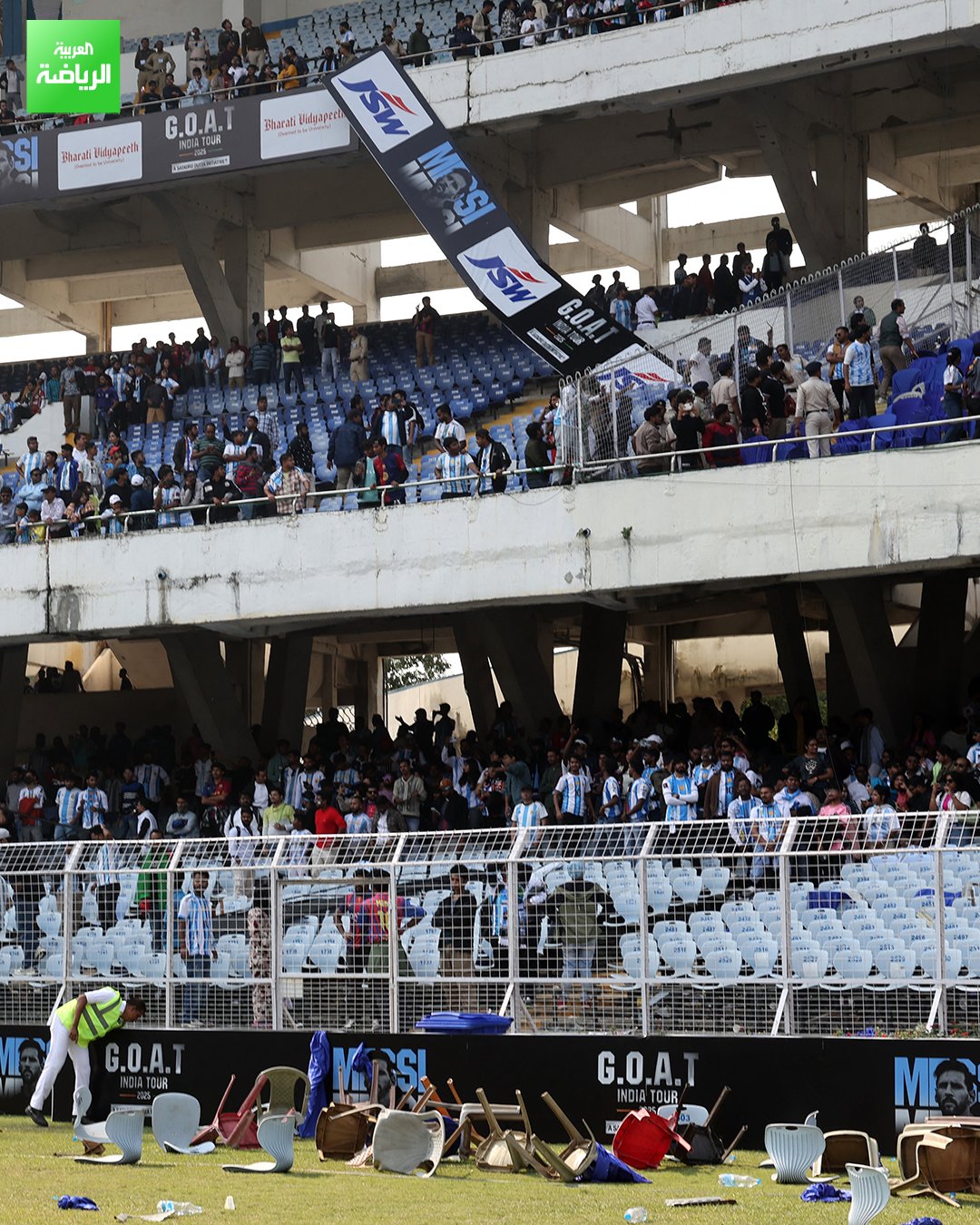 الجماهير المتواجدة في ملعب سولت ليك بمدينة كولكاتا الهندية تخرب وتحطم المدرجات احتجاجاً على رحيل ليونيل ميسي قبل رؤيته عن قرب، رغم ارتفاع أسعار التذاكر