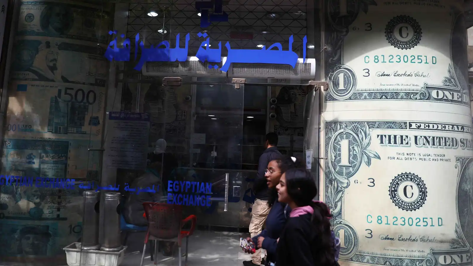 فتاتان تمران بجوار مكتب صرافة في العاصمة المصرية القاهرة، يوم 21 مارس 2022.