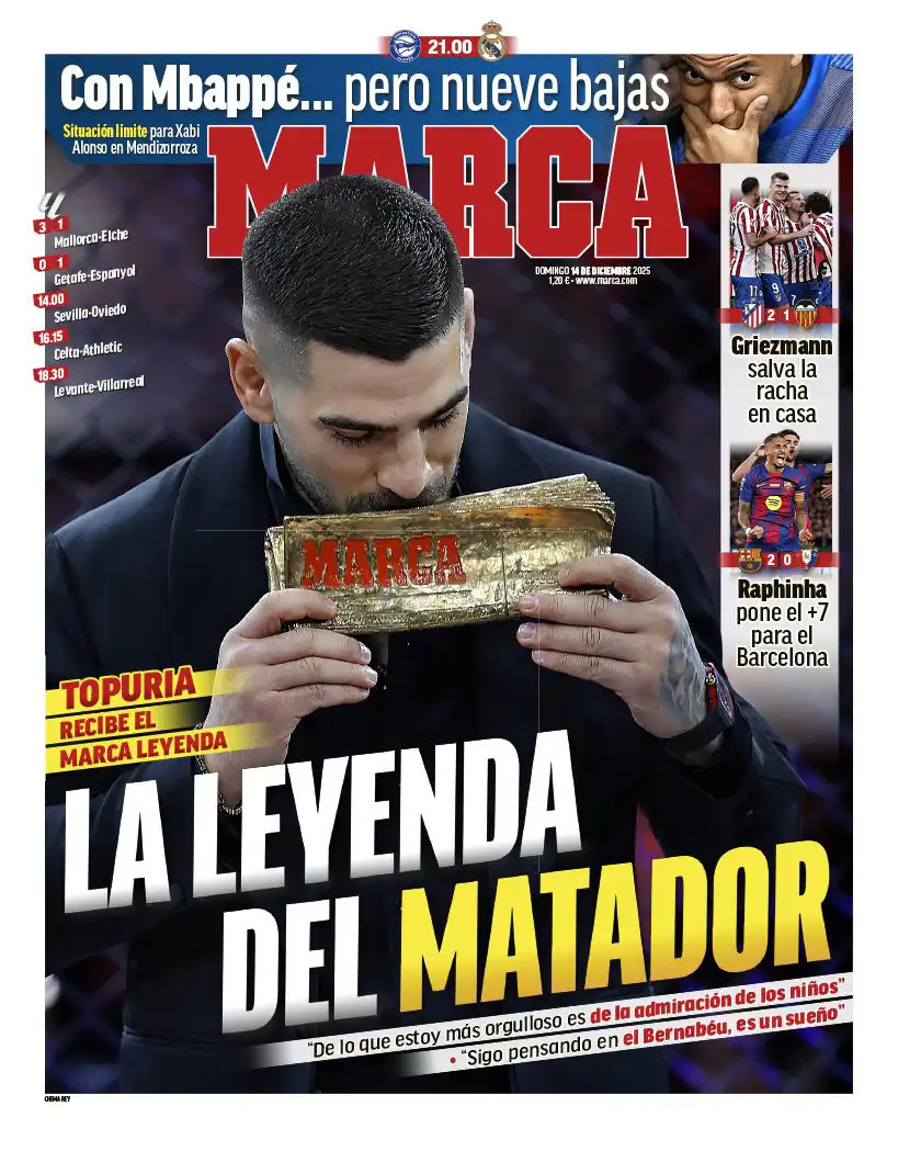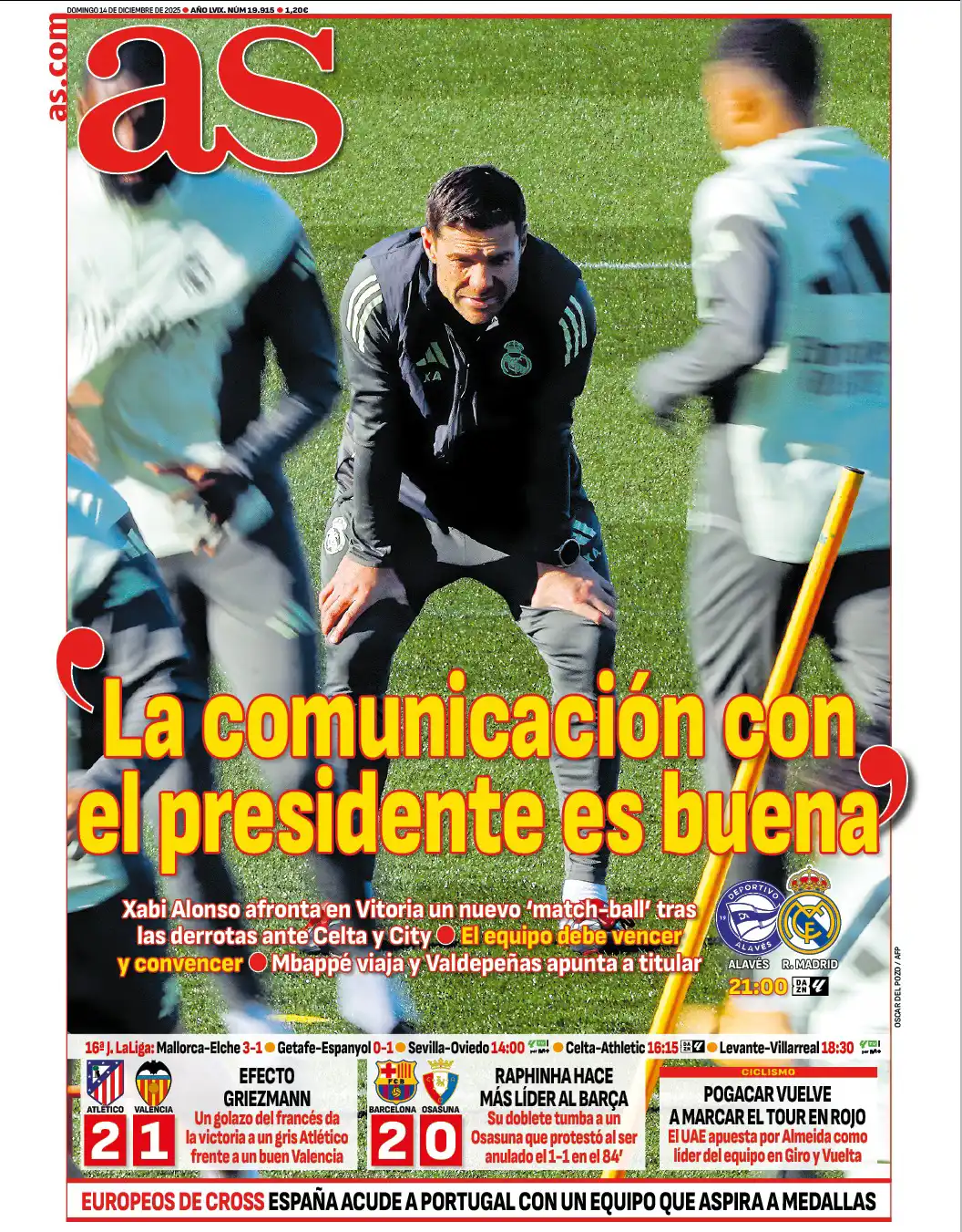 ركزت الصحيفة على مباراة ديبورتيفو ألافيس وريال مدريد في الدوري الإسباني، وكتبت: "مع مبابي لكن بسبعة غيابات"، و"وضع حرج لتشابي ألونسو في مينديزوروزا".