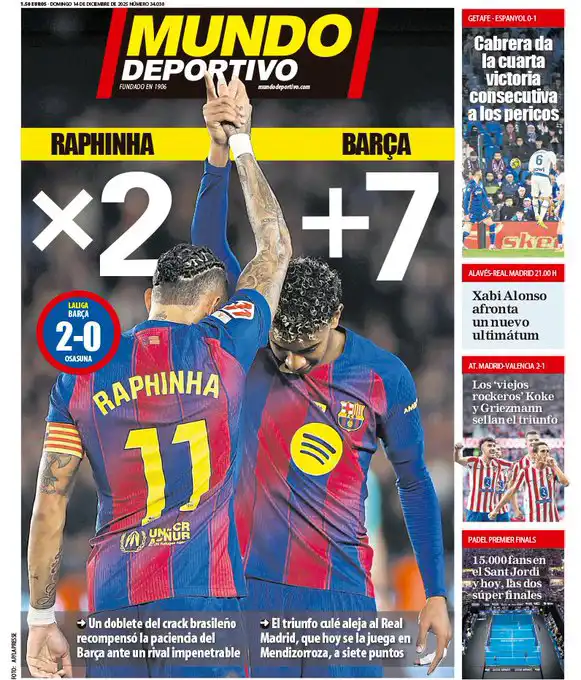 كما اهتمت بفوز برشلونة على أوساسونا بهدفي البرازيلي رافينيا، وكتبت: "رافينيا يوسع فارق برشلونة إلى +7".