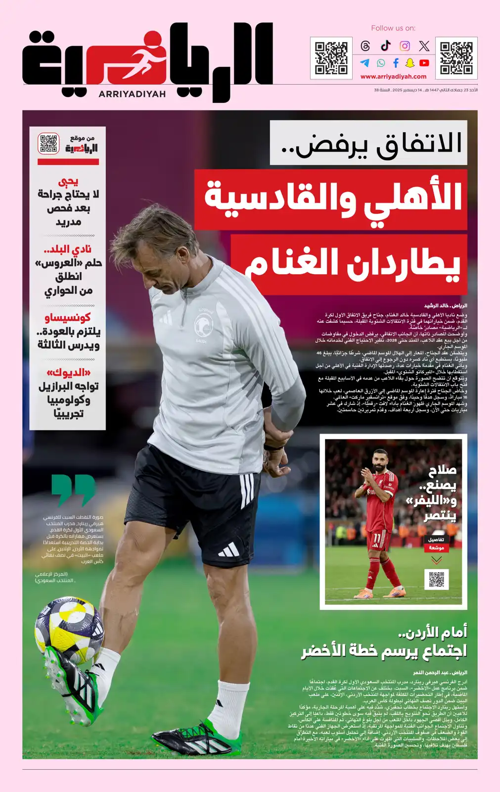 كما سلطت الصحف الضوء على مواجهة السعودية والأردن في نصف نهائي كأس العرب 2025، وفوز آرسنال على وولفرهامبتون واحتفاظه بصدارة الدوري الإنجليزي الممتاز.