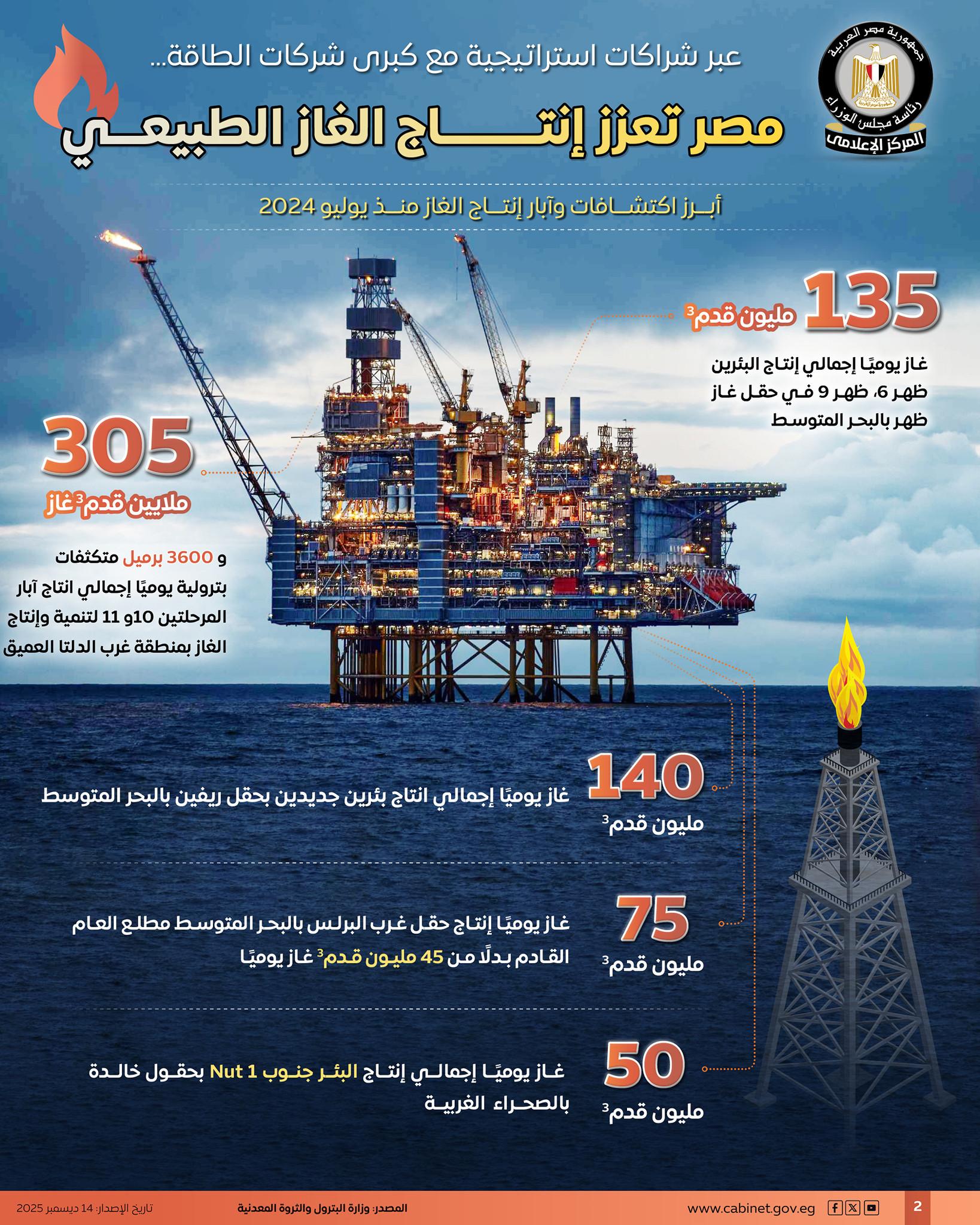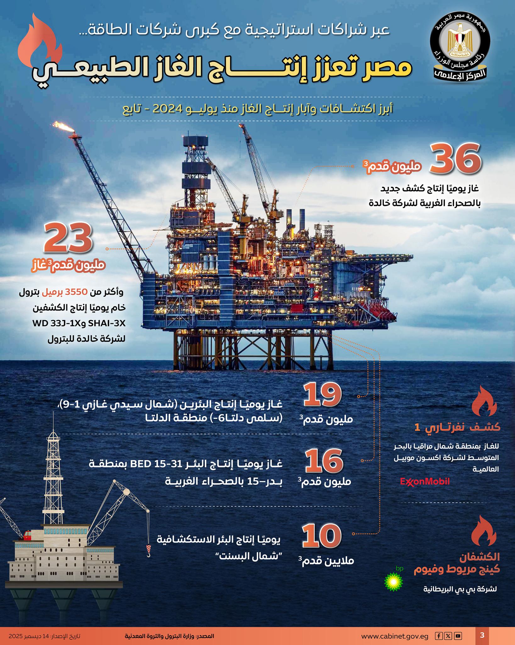 وبشأن أبرز اكتشافات وآبار إنتاج الغاز منذ يوليو 2024، أوضحت الإنفوجرافات أن إجمالي إنتاج بئري.....