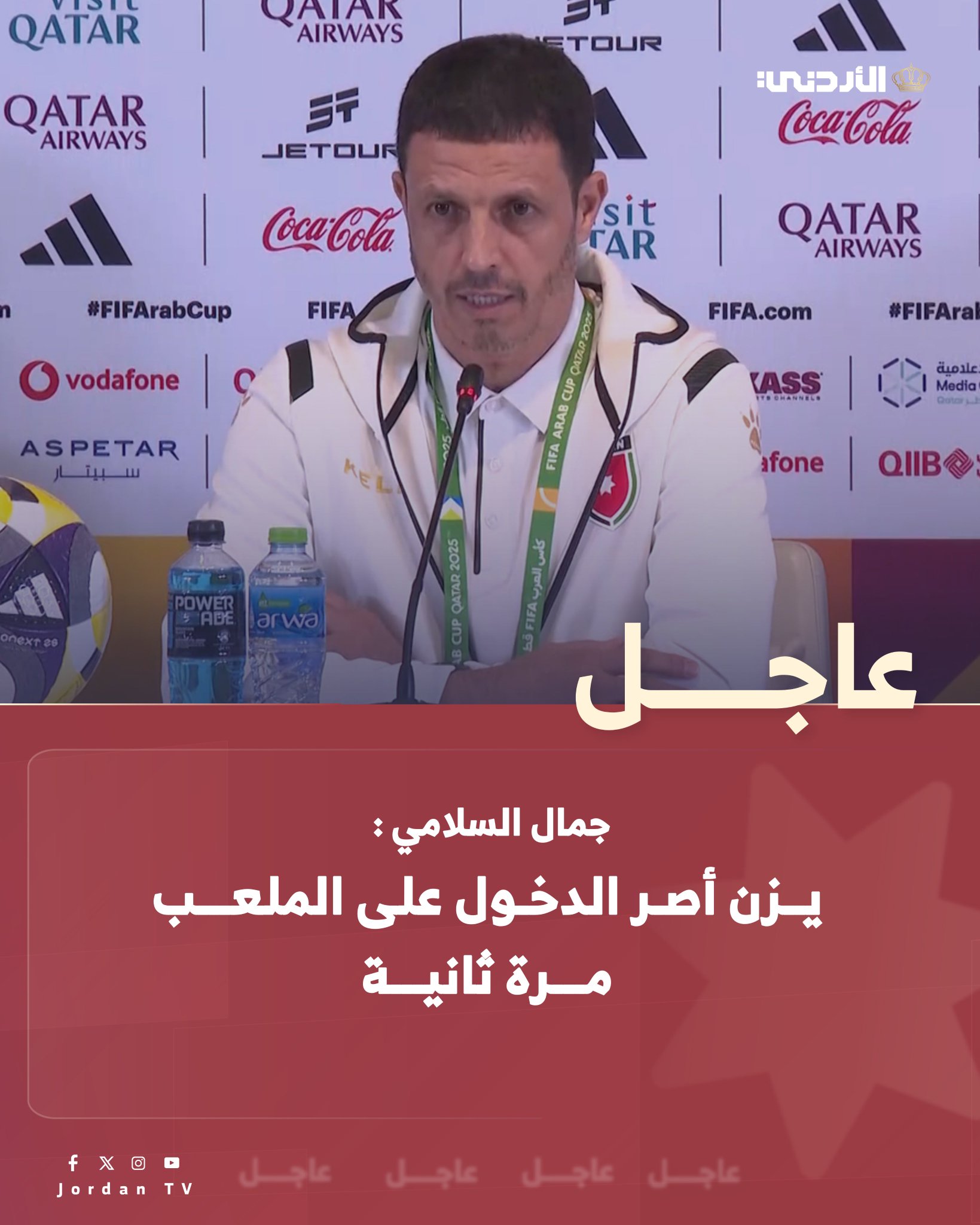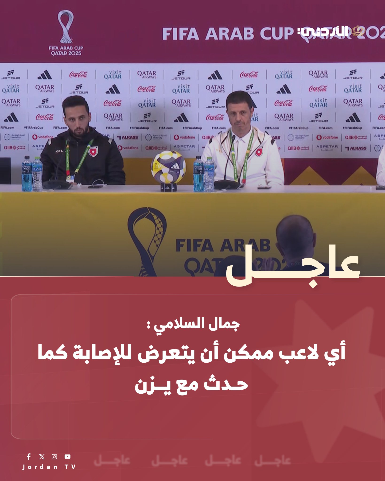 عاجل || المؤتمر الصحفي لمدرب المنتخب الوطني جمال السلامي / الدوحة. السلامي : سنفتقد يزن النعيمات في المباراة القادمة. أي لاعب ممكن أن يتعرض للإصابة كما حدث مع يزن. يزن أصر الدخول على الملعب مرة ثانية #عاجل