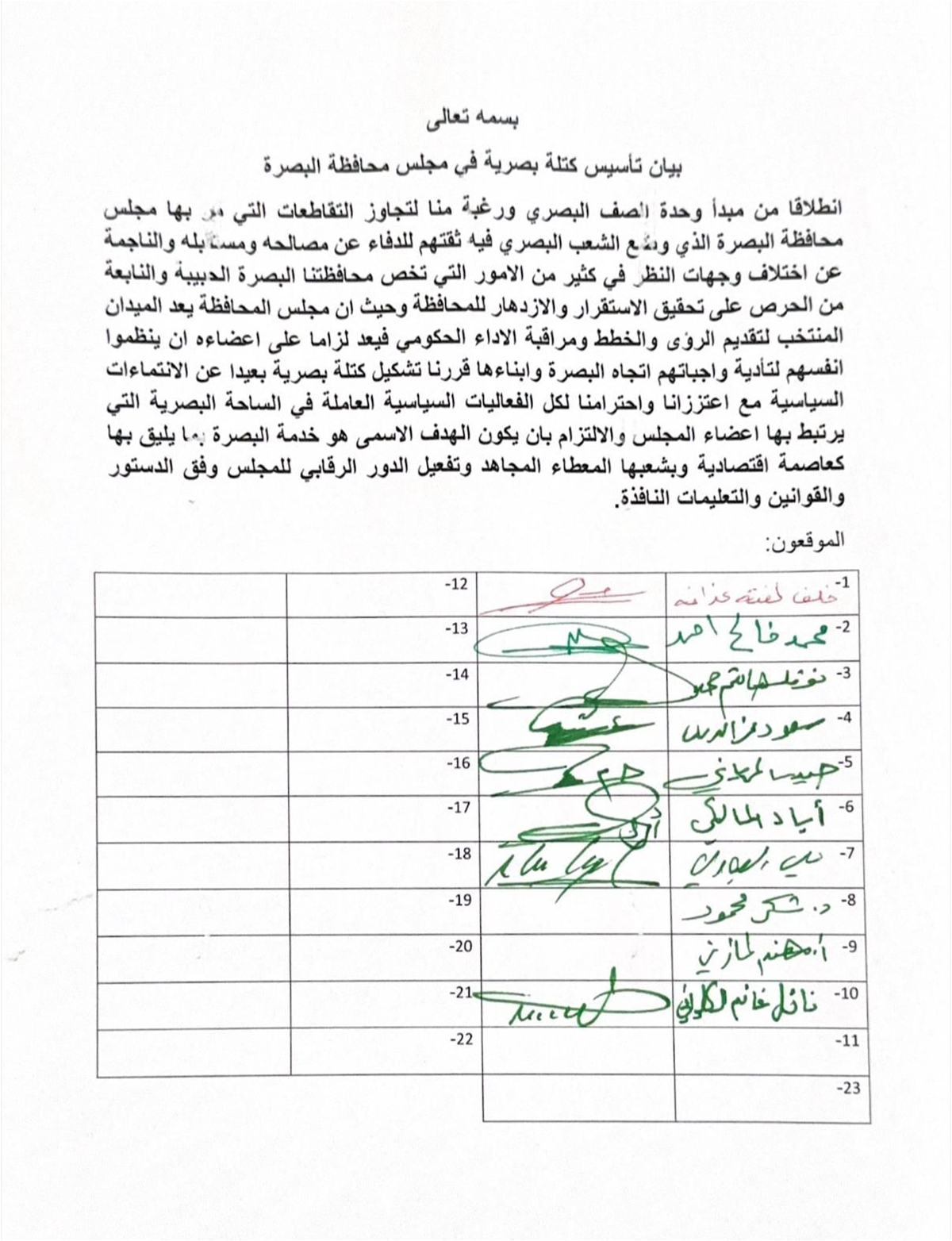 أعلنت عضو مجلس محافظة البصرة شكر محمود العامري اليوم الاحد، تشكيل كتلة جديدة داخل مجلس المحافظة؛ "تتجاوز التقاطعات والانتماءات". وقال العامري لـ السومرية نيوز، إن "الكتلة الجديدة تضم 10 أعضاء، وهدفها تجاوز التقاطعات التي مر بها المجلس وتحقيق الاستقرار للمحافظة".