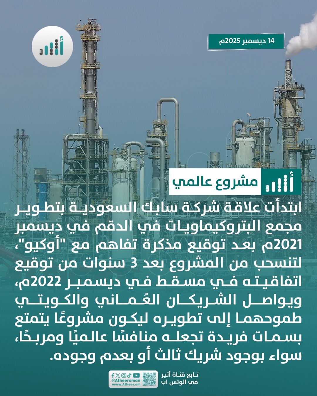 أثير| المضي قدما في مشروع تطوير مجمع البتروكيماويات في المنطقة الاقتصادية الخاصة بالدقم رغم انسحاب "سابك" السعودية